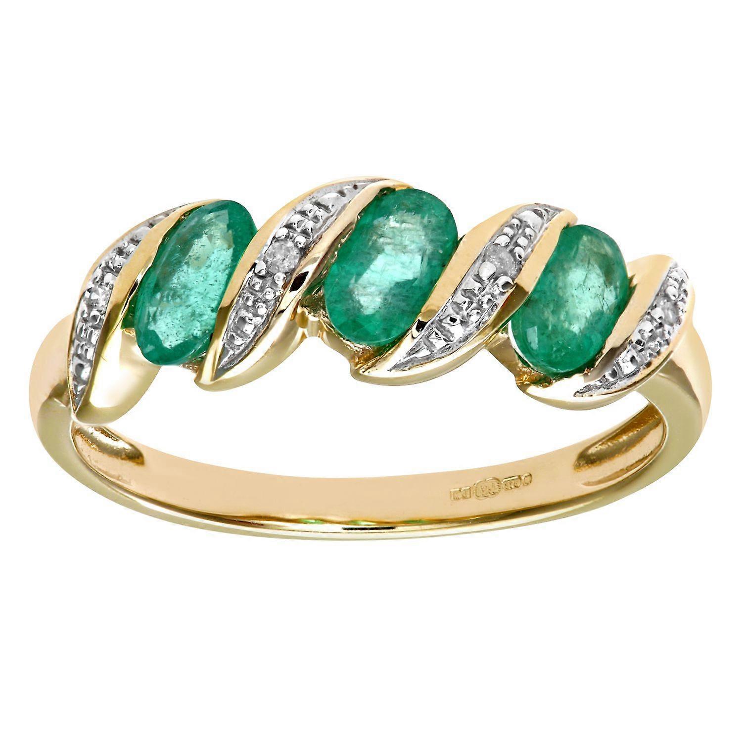 Jewelco London 9ct Gold Round 2pts Diamond Oval 0.69ct Emerald Wavy Ribbon Pod Trilogy Cocktail Ring 2mm