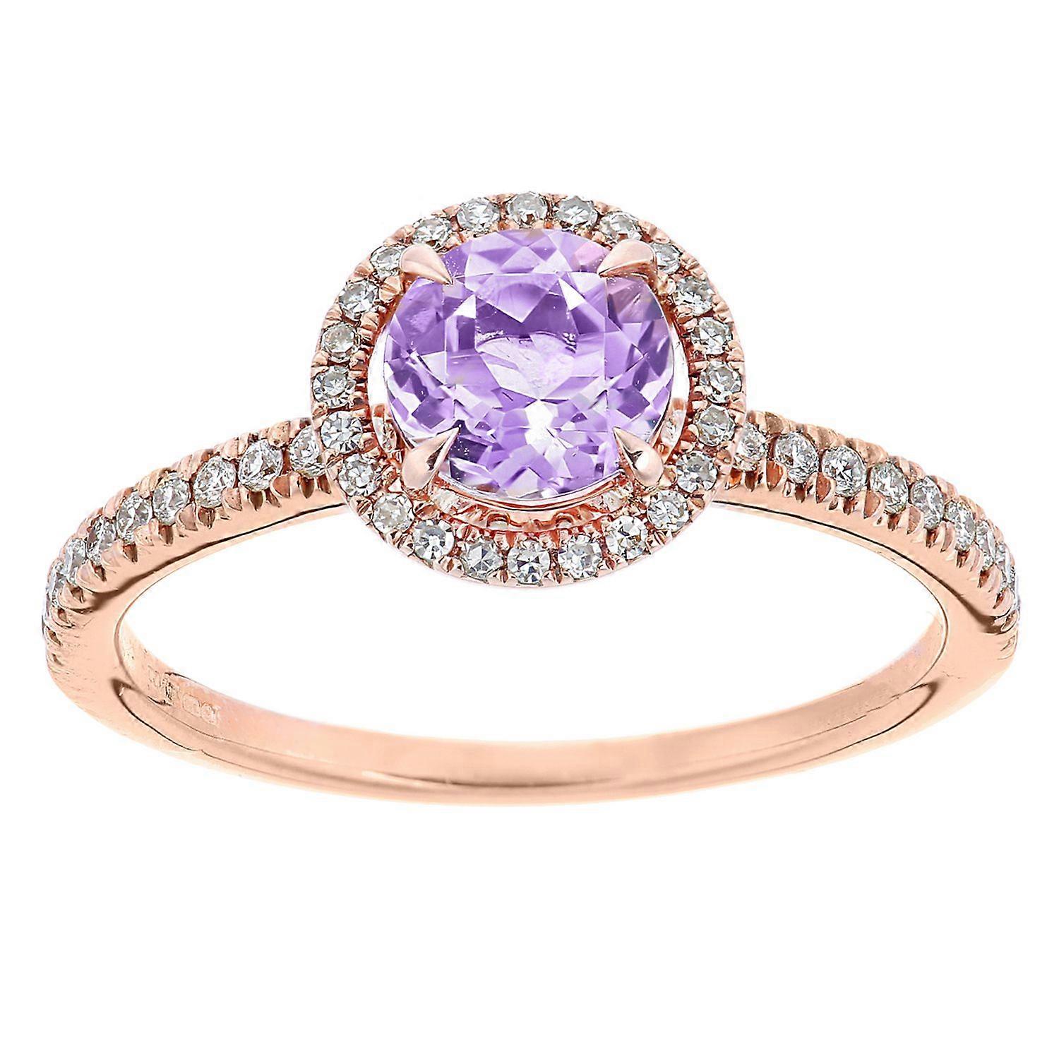 Jewelco London 9ct Rose Gold Round 0.3ct Diamond Round 0.71ct Amethyst Halo Engagement Ring. Width: 1.5mm Gauge: 1.4mm Weight: 2.4g GEMSTONE: Amethyst, Round, Purple, 0.71ct, Natural GEMSTONE 2: Diamond, Round, White, I3, 0.3ct, Natural SKU: PR2AXL0438RAM