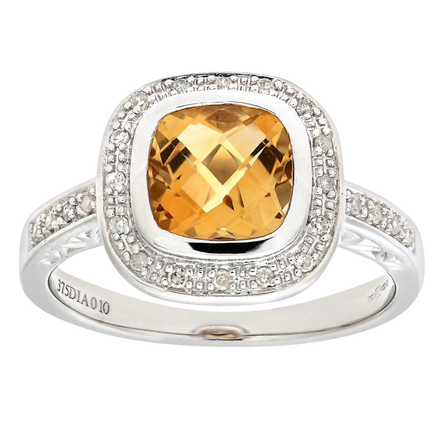 Jewelco London 9ct White Gold 10pts Diamond Cushion 1.35ct Citrine Square Cushion Halo Solitaire Ring 12mm