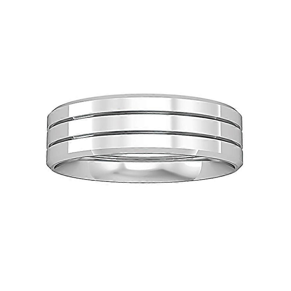 Jewelco London 9ct White Gold Flat-Court Double Groove Bevelled Band Wedding Ring 6mm