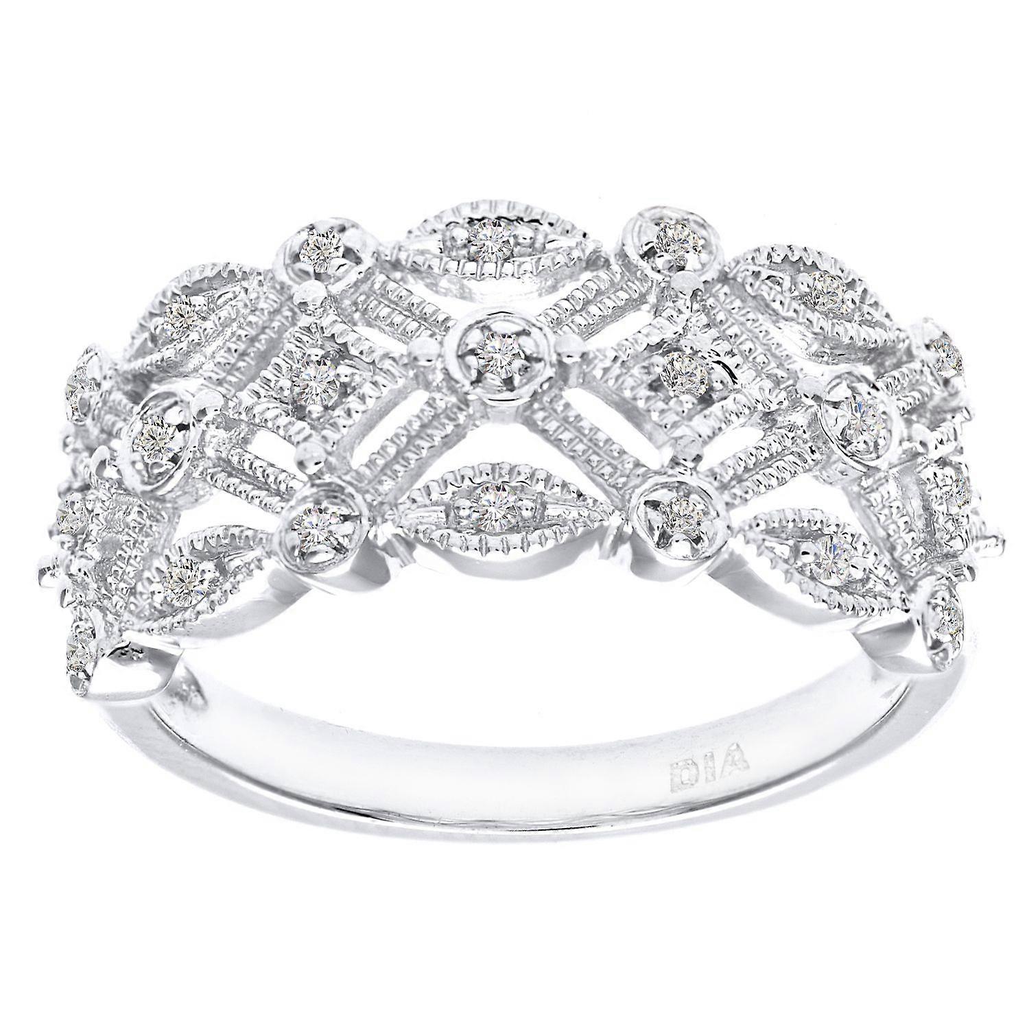 Jewelco London 9ct White Gold Round 10pts Diamond Art Deco Floral Filigree Dress Ring
