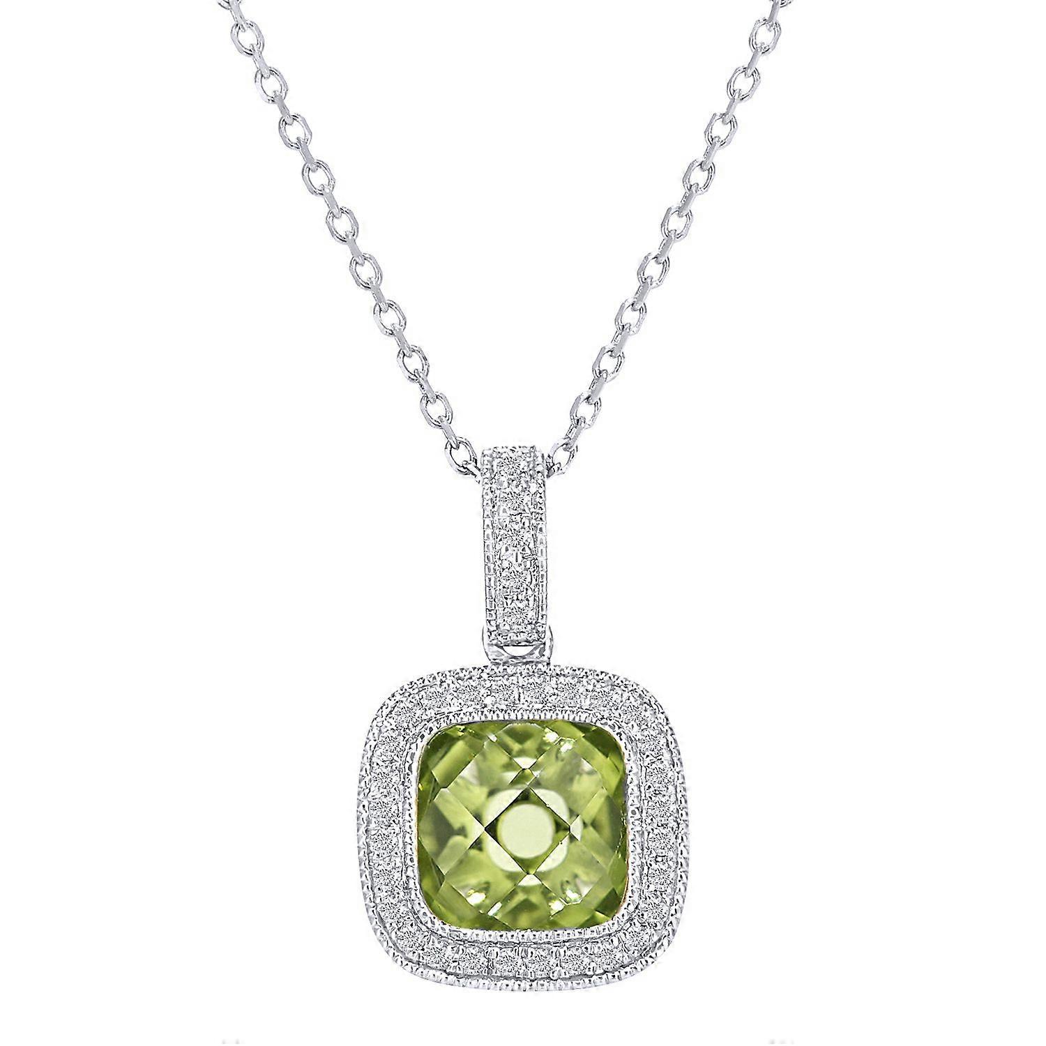 Jewelco London 9ct White Gold Round 10pts Diamond Cushion 1.4ct Peridot Cocktail Pendant Necklace 16 inch 42cm