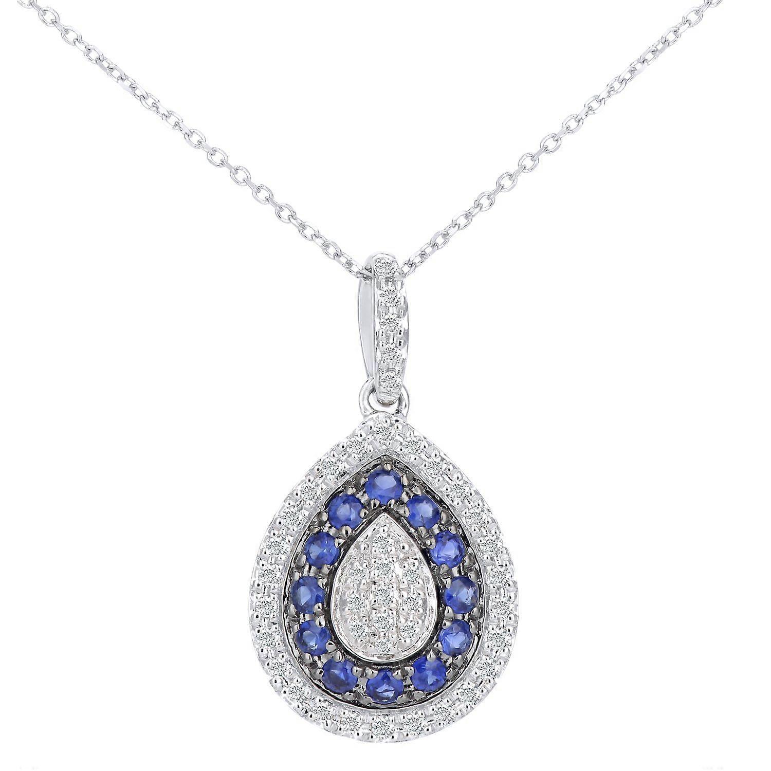 Jewelco London 9ct White Gold Round 15pts Diamond Round 0.3ct Sapphire Teardrop Pendant Necklace 16 inch 42cm