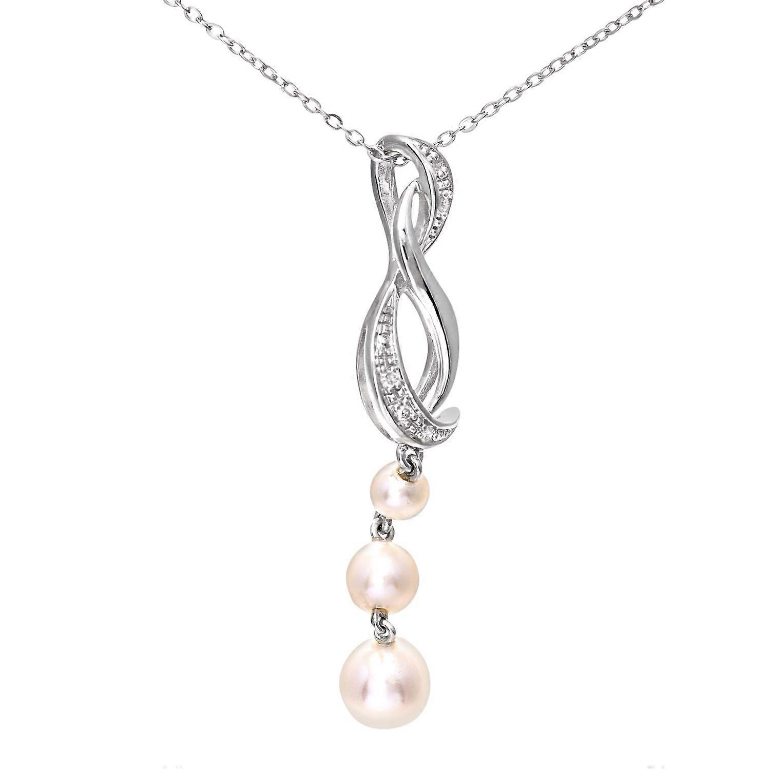 Jewelco London 9ct White Gold Round 2.3pts Diamond Round Pearl 3/4/5mm Trilogy Ampersand Pendant Necklace 18 inch 46cm