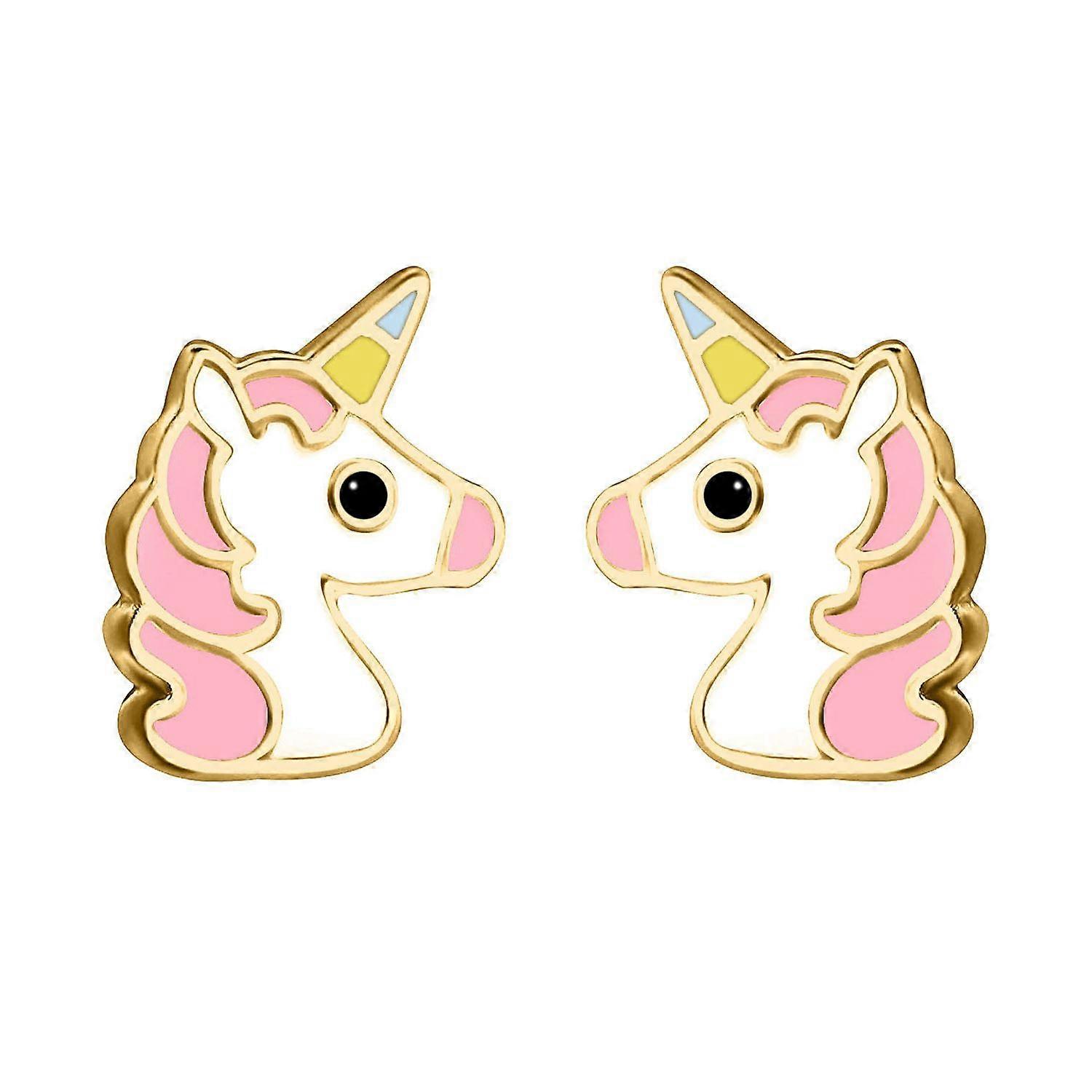 Jewelco London 9ct Yellow Gold Enamel Cute Cartoon Unicorn Stud Earrings 9mm