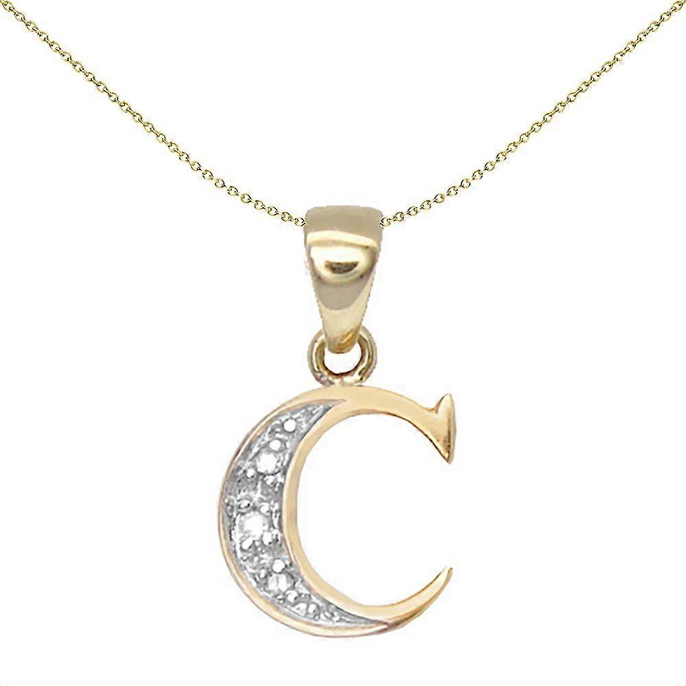 Jewelco London 9ct Yellow Gold Pave Set Round H I2 0.02ct Diamond Identity Dainty Initial ID Charm Pendant Letter C