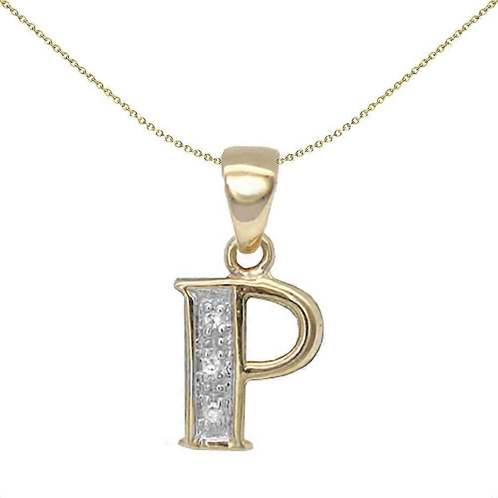Jewelco London 9ct Yellow Gold Pave Set Round H I2 0.02ct Diamond Identity Dainty Initial ID Charm Pendant Letter P