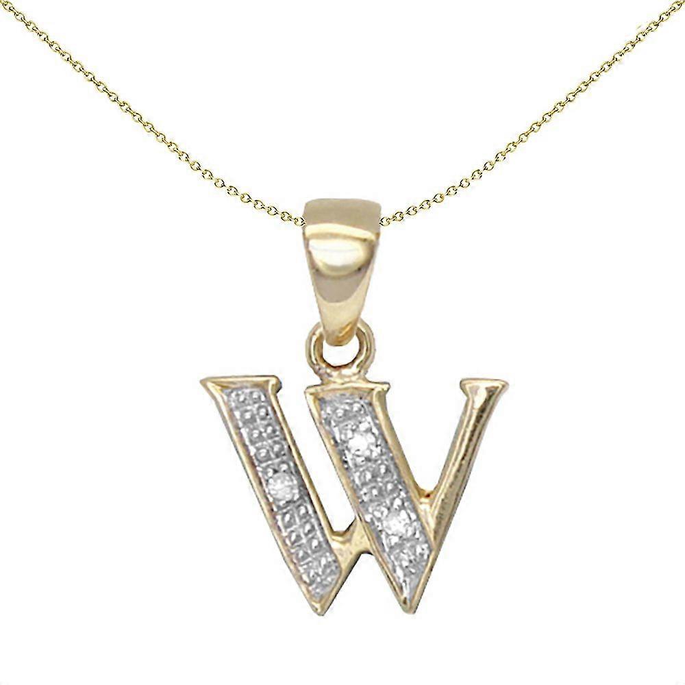 Jewelco London 9ct Yellow Gold Pave Set Round H I2 0.02ct Diamond Identity Dainty Initial ID Charm Pendant Letter W