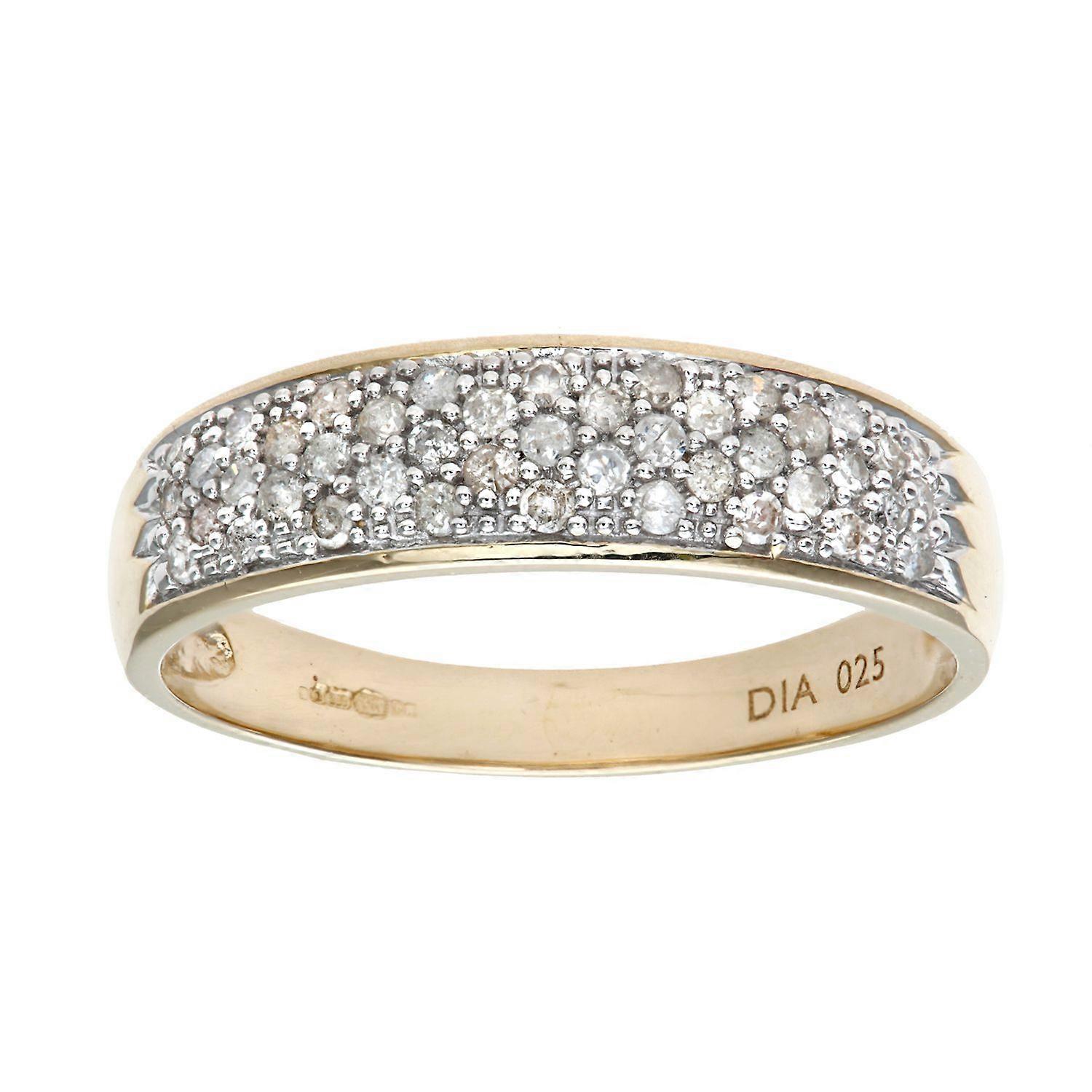 Jewelco London 9ct Yellow Gold Round 1/4ct Diamond Diagonal 5 Row Pave Half Eternity Ring 2.5mm. Width: 2.5mm Gauge: 1mm Weight: 2.1g GEMSTONE: Diamond, Round, White, I2-I3, 0.25ct, Natural SKU: PR0AXL5247Y