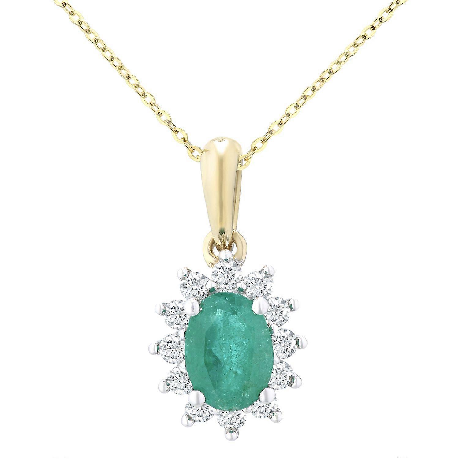 Jewelco London 9ct Yellow Gold Round 1/4ct Diamond Oval 0.6ct Emerald Cluster Pendant Necklace 18 inch 46cm