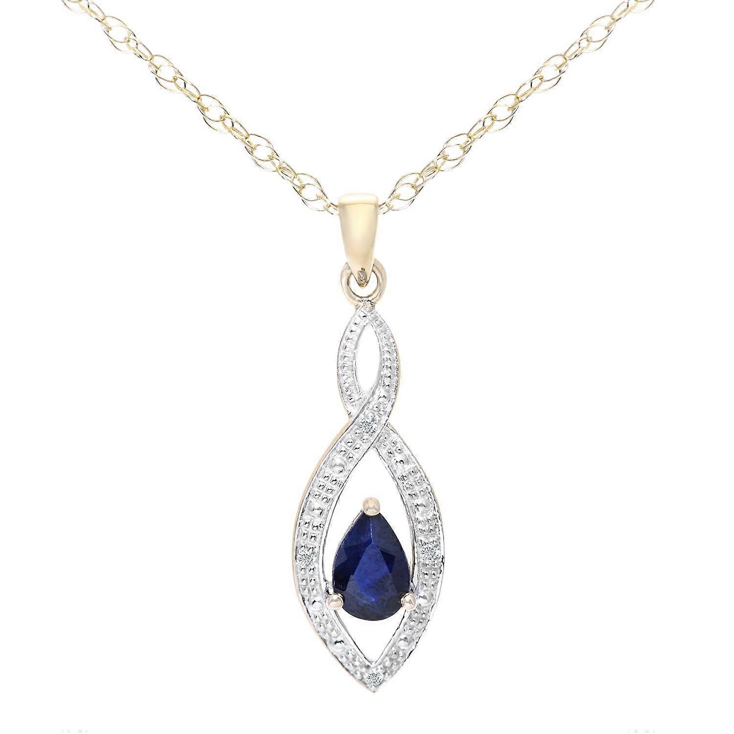 Jewelco London 9ct Yellow Gold Round 1.5pts Diamond Pear 0.6ct Sapphire Teardrop Pendant Necklace 18 inch 46cm