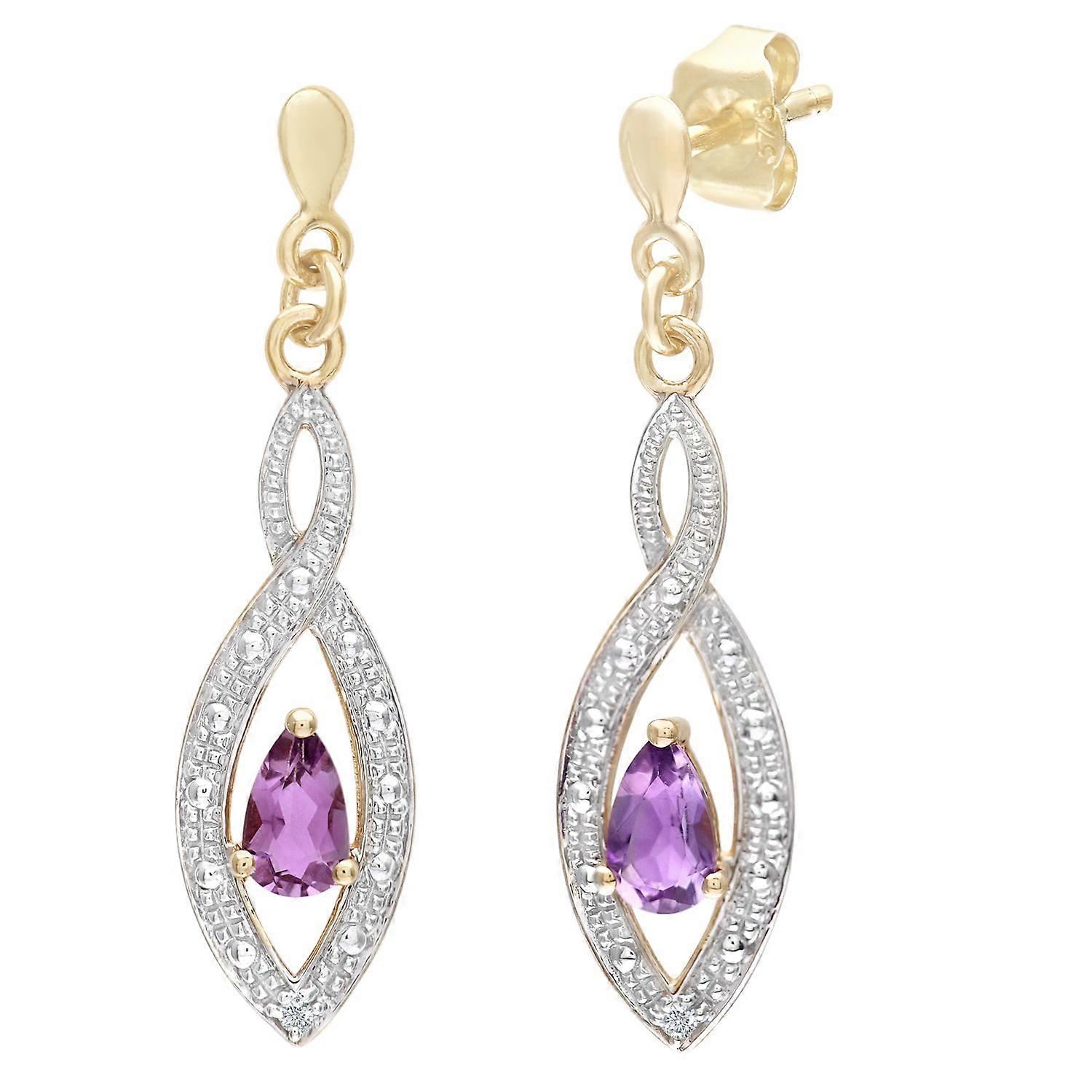 Jewelco London 9ct Yellow Gold Round 1pts Diamond Pear 0.36ct Amethyst Teardrop Drop Earrings