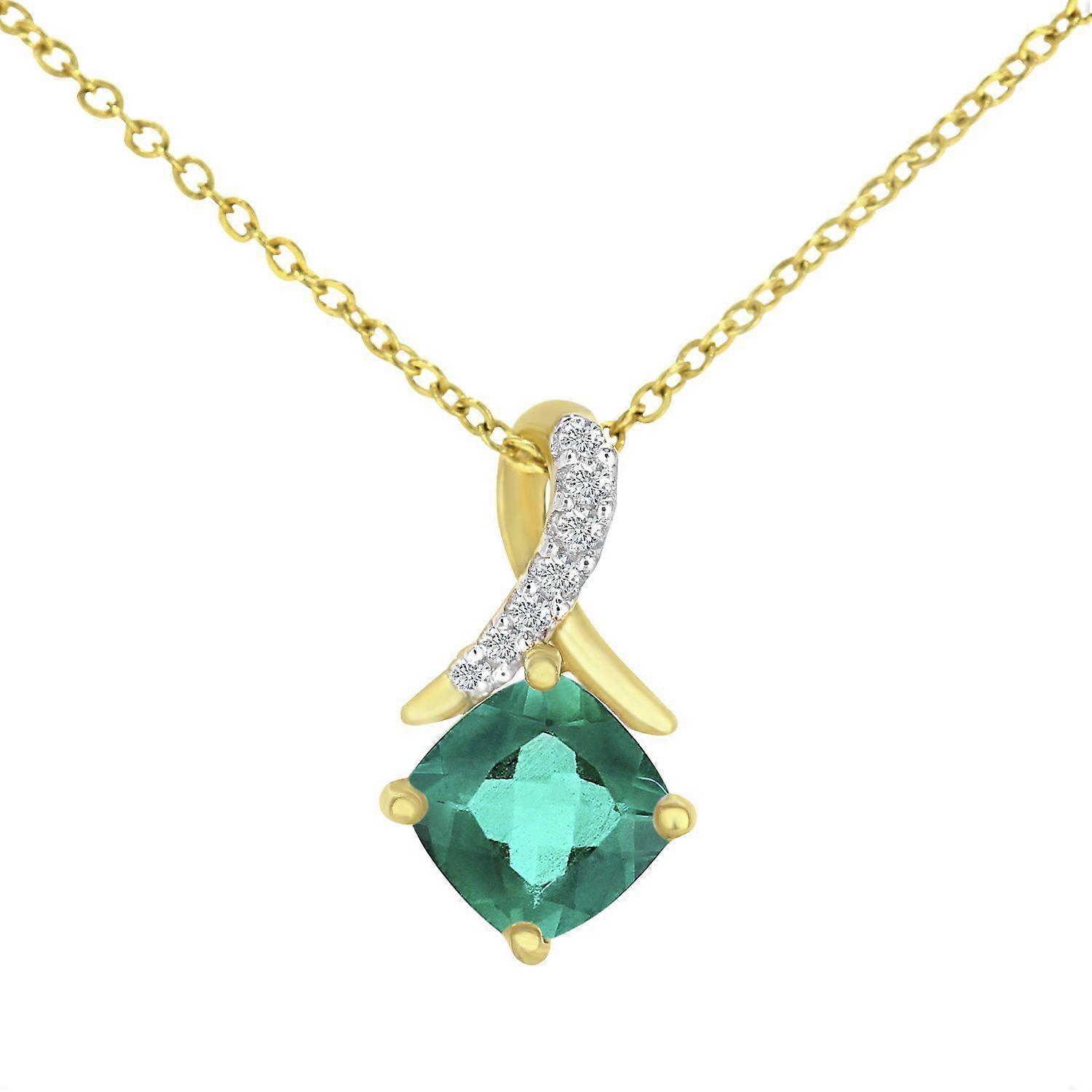 Jewelco London 9ct Yellow Gold Round 2pts Diamond Cushion 1/2ct Created Emerald Kiss Crossover Pendant Necklace 18 inch 46cm