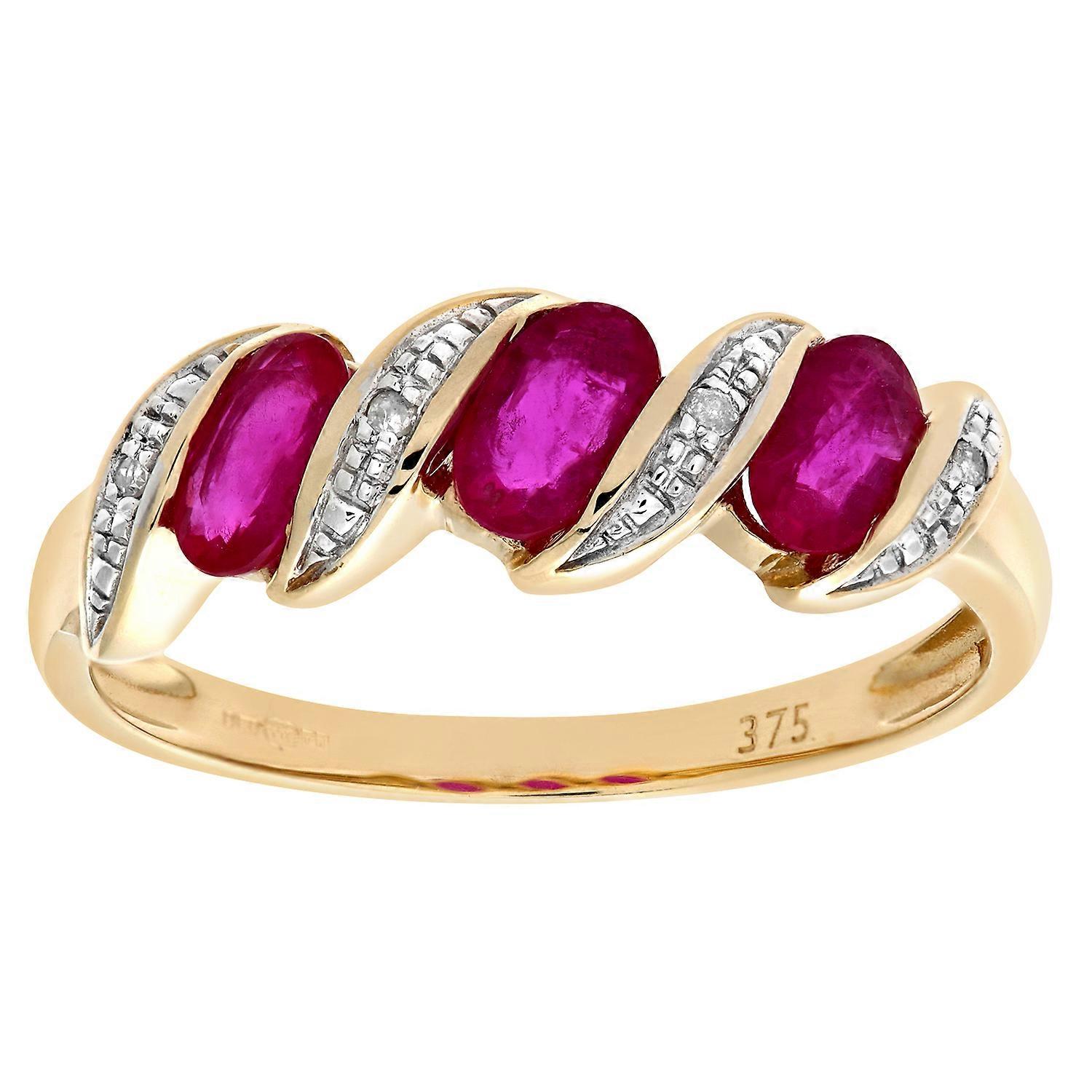 Jewelco London 9ct Yellow Gold Round 2pts Diamond Oval 0.95ct Ruby Wavy Ribbon Pod Trilogy Cocktail Ring 2mm