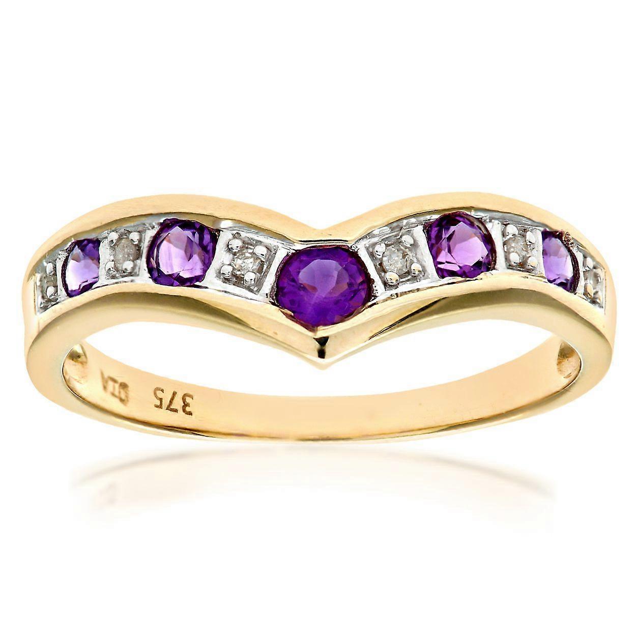 Jewelco London 9ct Yellow Gold Round 2pts Diamond Round 0.46ct Amethyst Alternating Channel Wishbone Ring 2mm