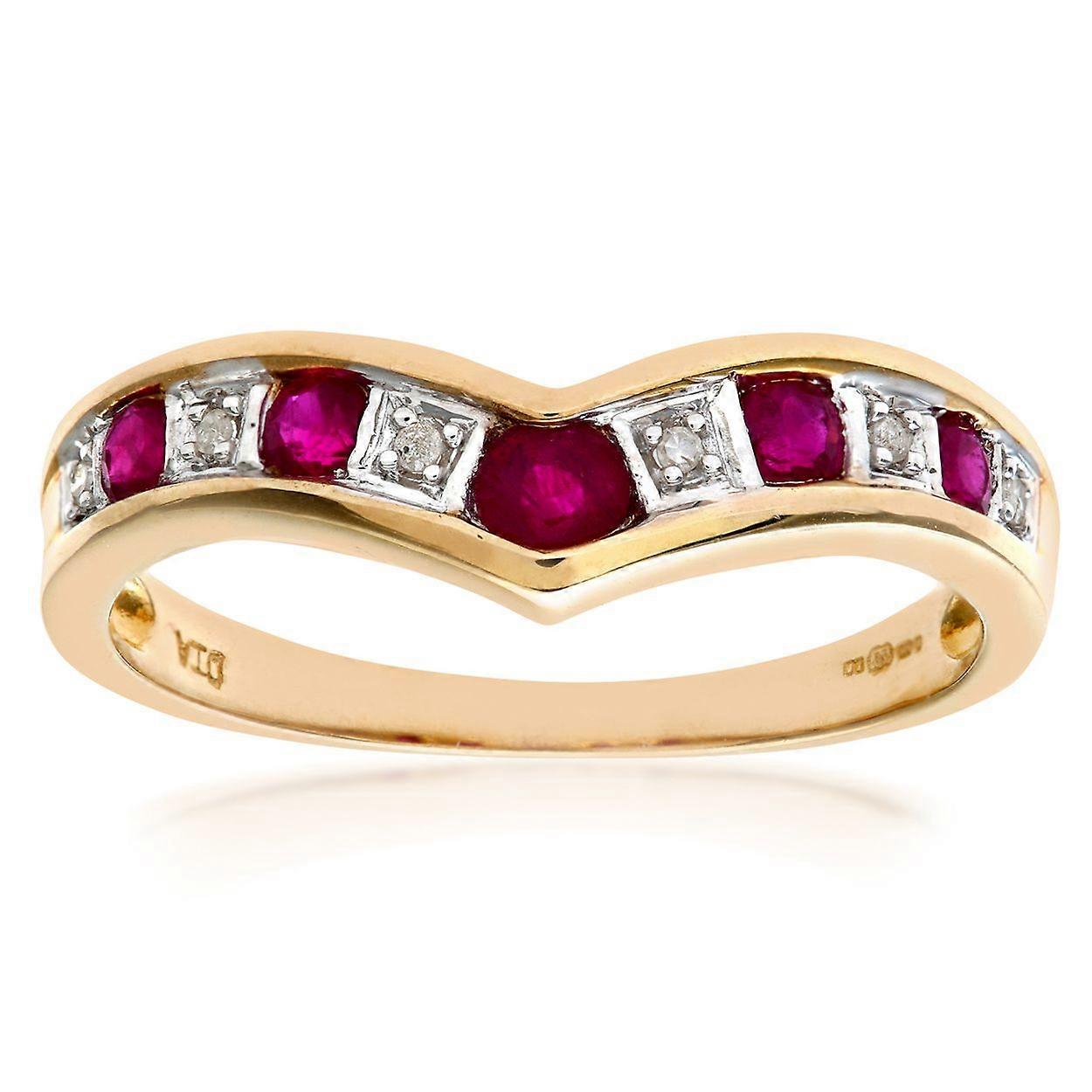 Jewelco London 9ct Yellow Gold Round 2pts Diamond Round 0.46ct Ruby Alternating Channel Wishbone Ring 2mm