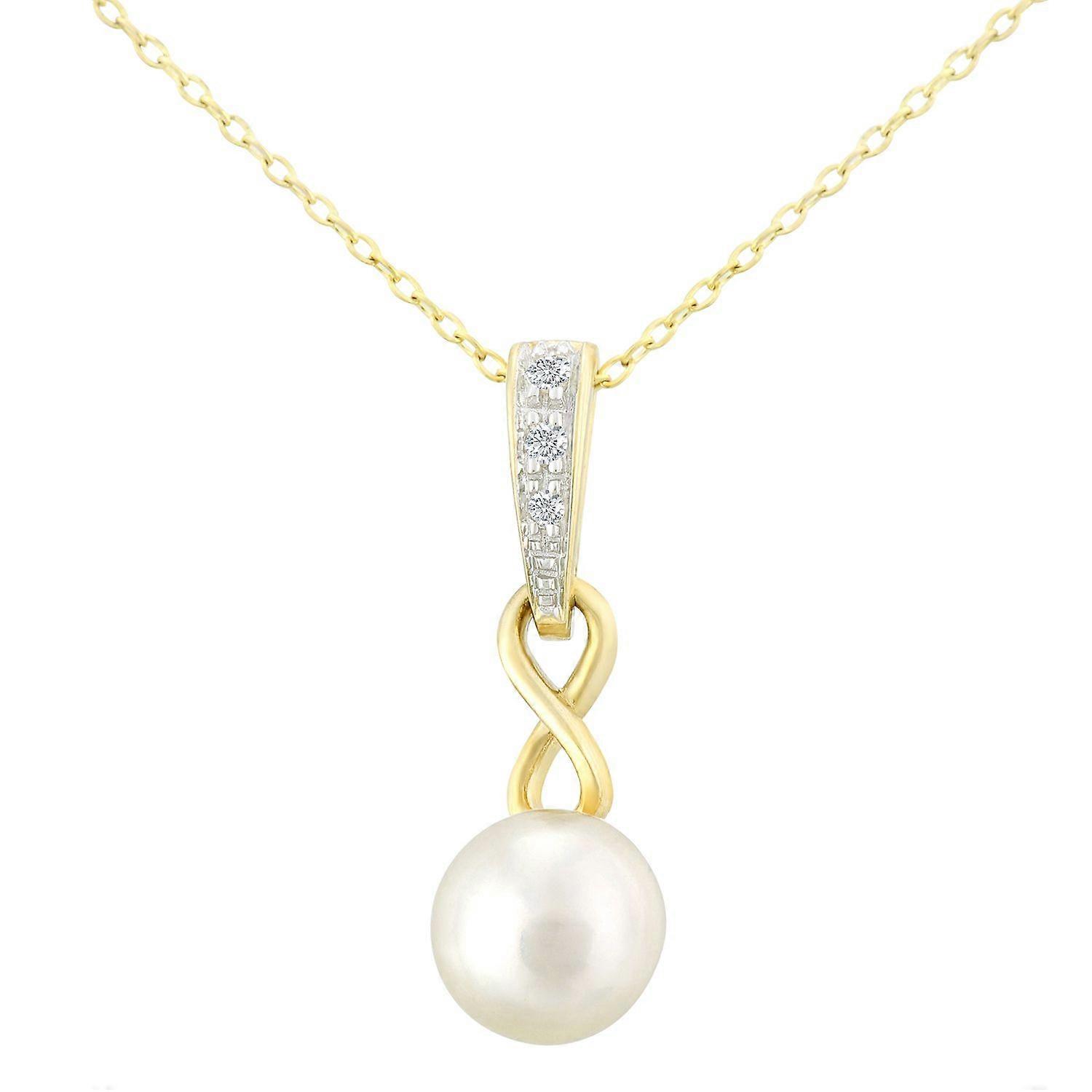 Jewelco London 9ct Yellow Gold Round 2pts Diamond Round Pearl 6mm Infinity Pendant Necklace 18 inch 46cm