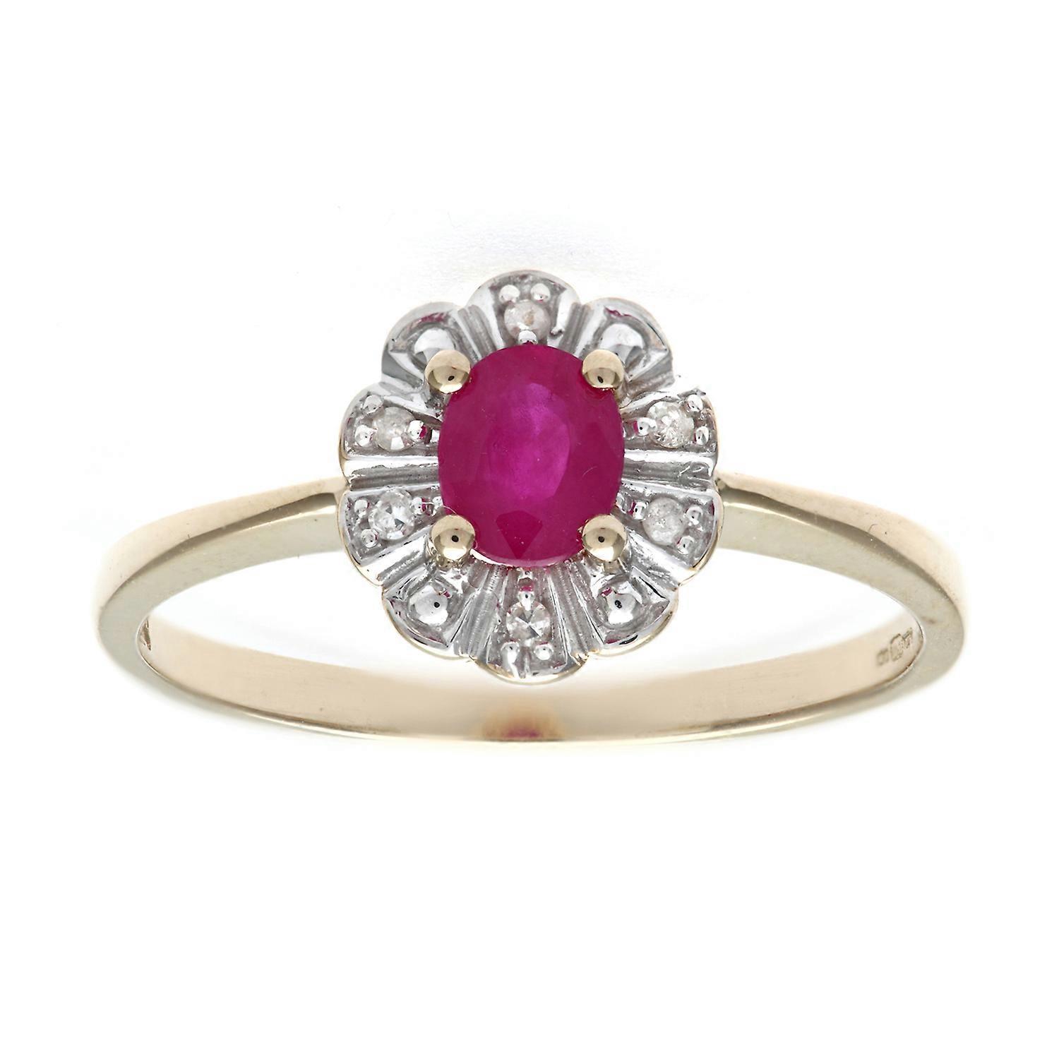 Jewelco London 9ct Yellow Gold Round 3pts Diamond Oval 0.44ct Ruby Flower Petal Cluster Ring