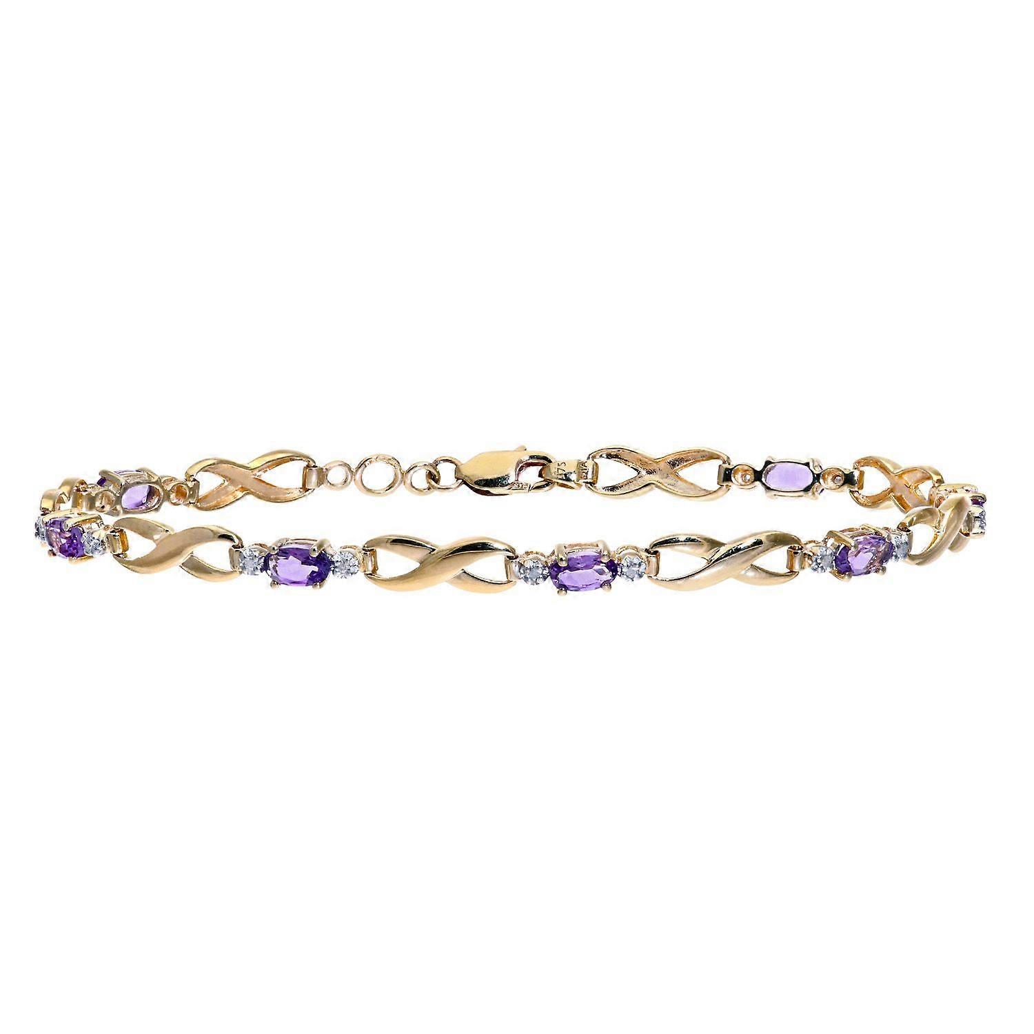 Jewelco London 9ct Yellow Gold Round 5pts Diamond Oval 1.48ct Amethyst Kiss Charm Bracelet