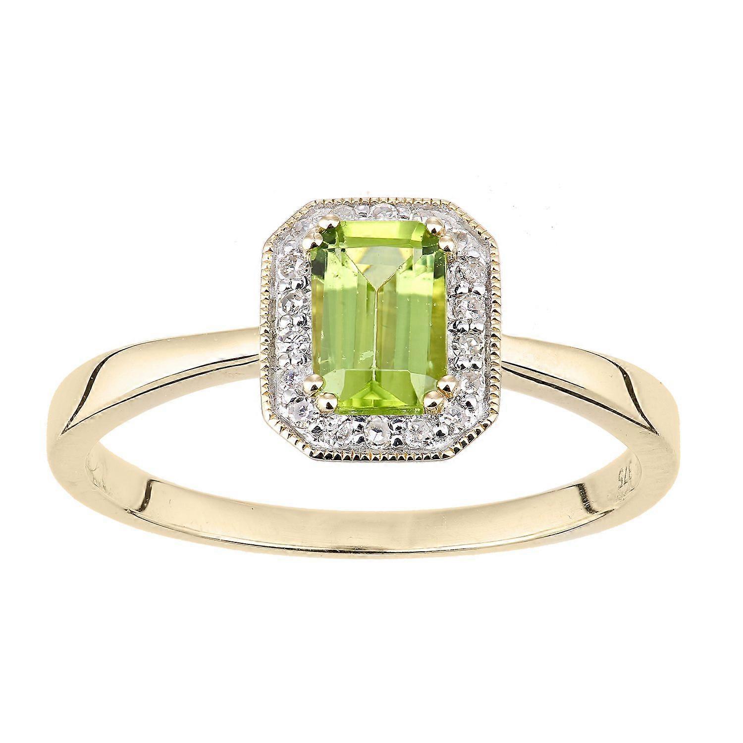 Jewelco London 9ct Yellow Gold Round 8pts Diamond Octagon 0.58ct Peridot Octagon Mill Grain Halo Cluster Ring