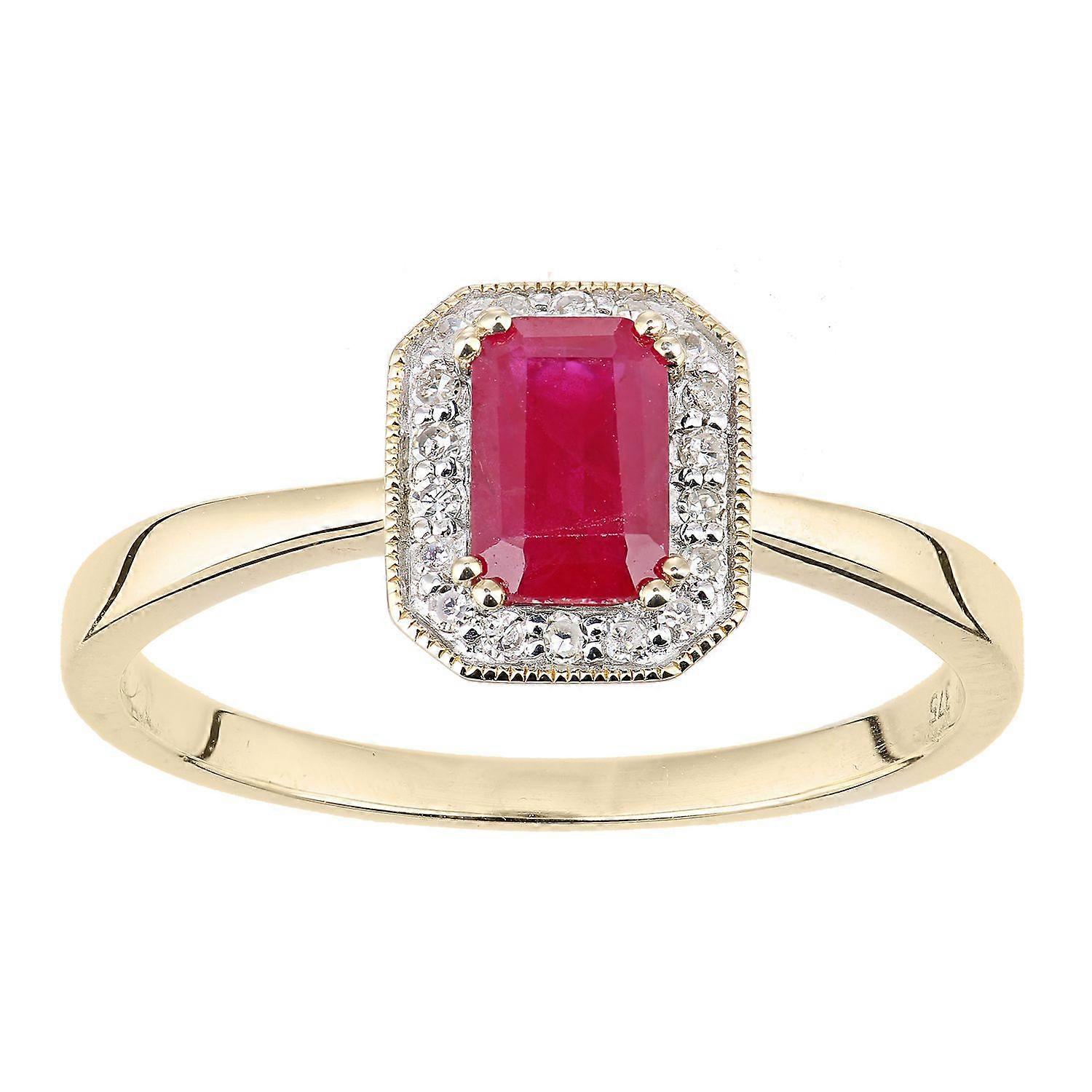 Jewelco London 9ct Yellow Gold Round 8pts Diamond Octagon 0.63ct Ruby Octagon Mill Grain Halo Cluster Ring