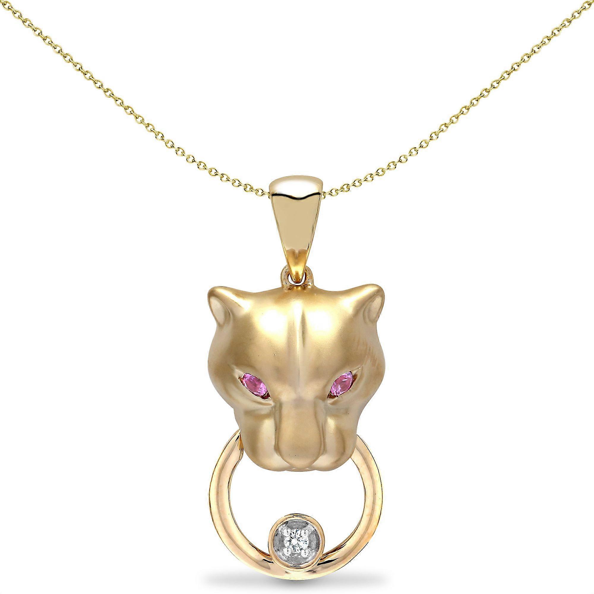 Jewelco London 9ct Yellow Gold Rub Over Set 0.03ct Diamond and Pink 0.07ct Sapphire Panther Door Knocker Charm Pendant