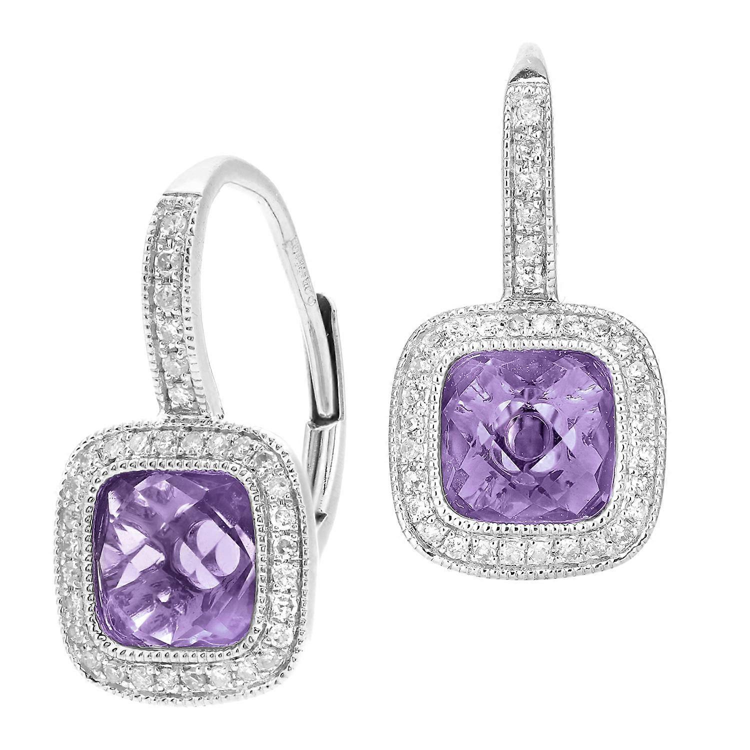 Jewelco London 9ct White Gold Round 20pts Diamond Cushion 2.5ct Amethyst Cocktail Drop Earrings