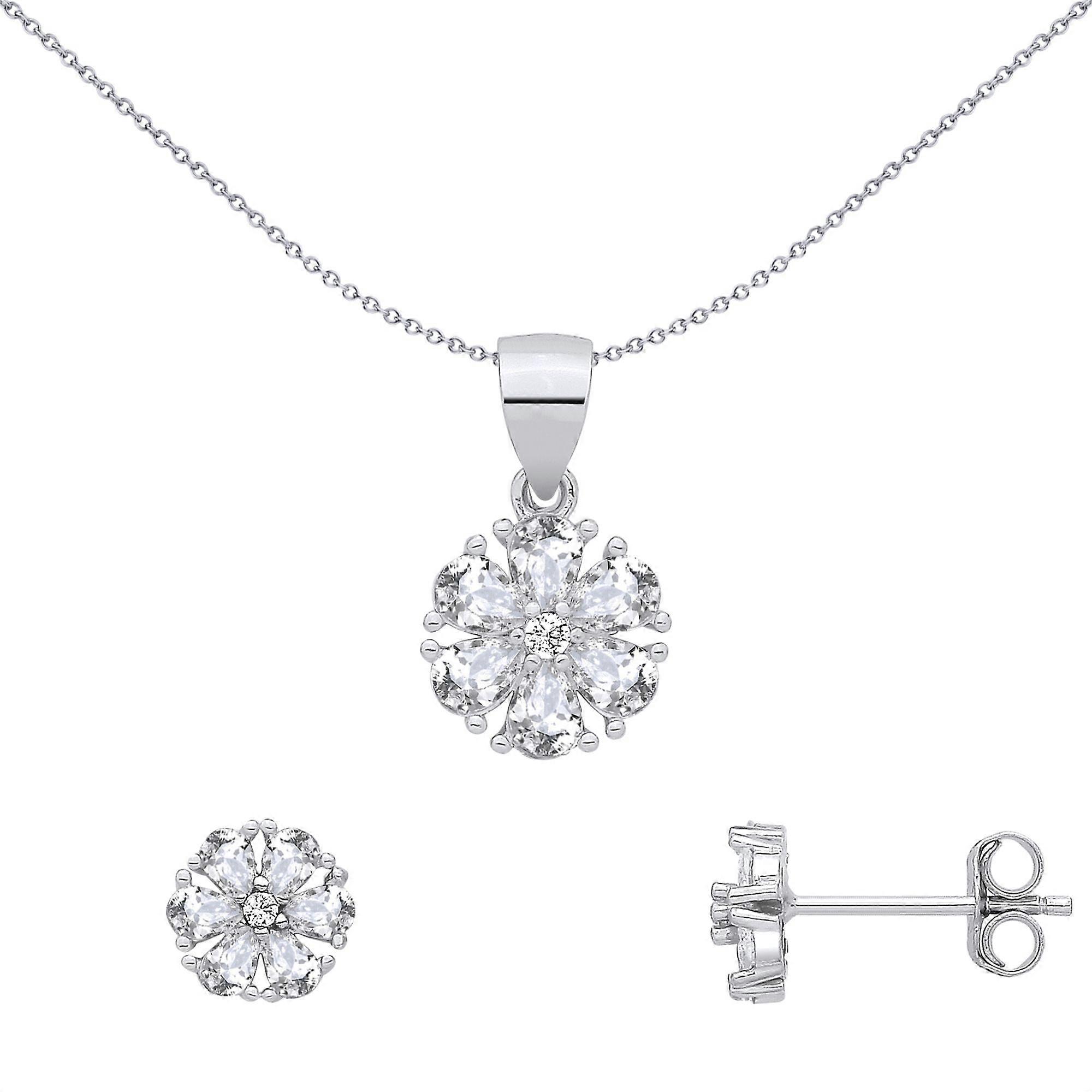 Jewelco London Sterling Silver CZ Flower Earrings & Pendant Set