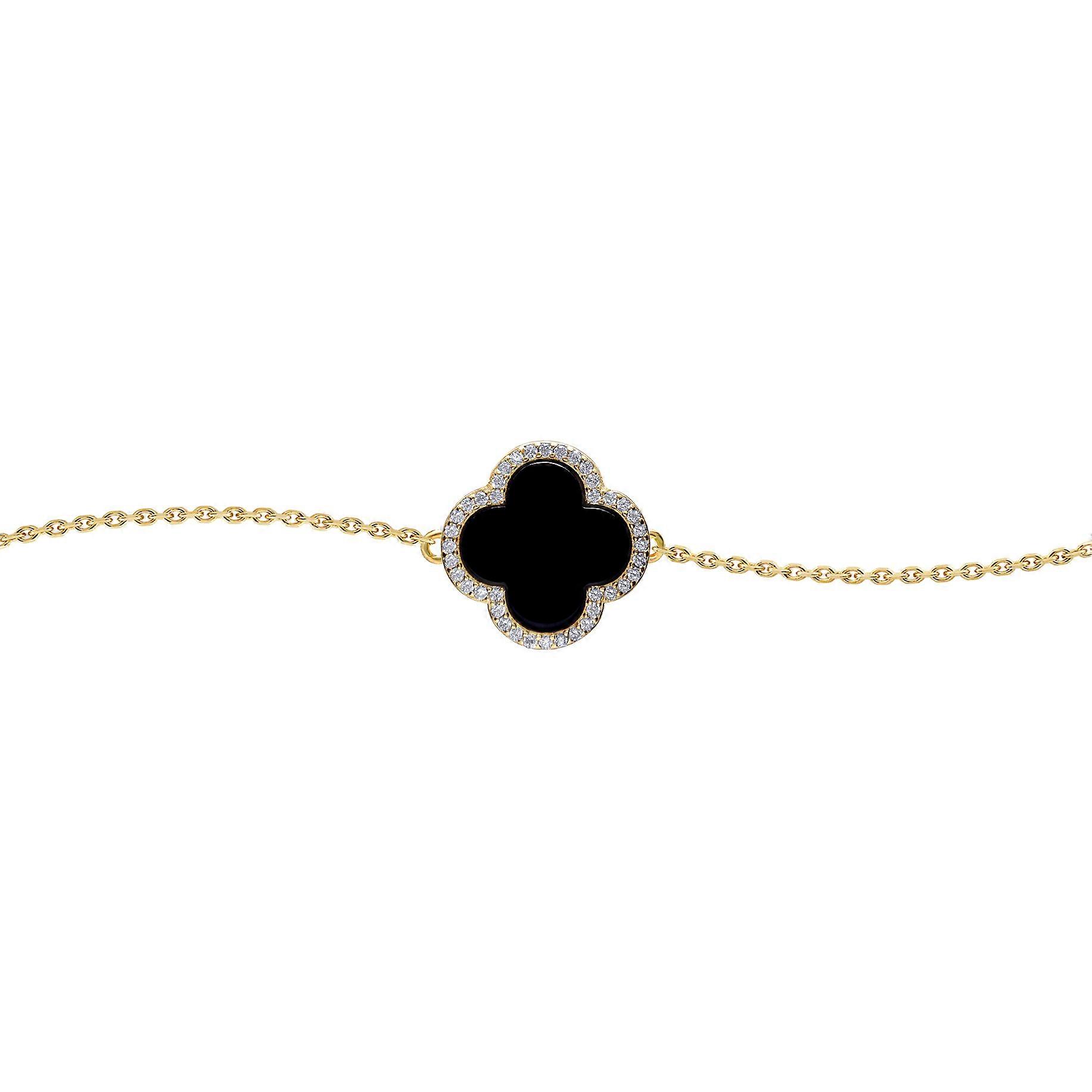 Jewelco London Gold-plated Silver Black Clover Onyx & CZ Halo Lucky Charm Chain Bracelet 7-8.5"