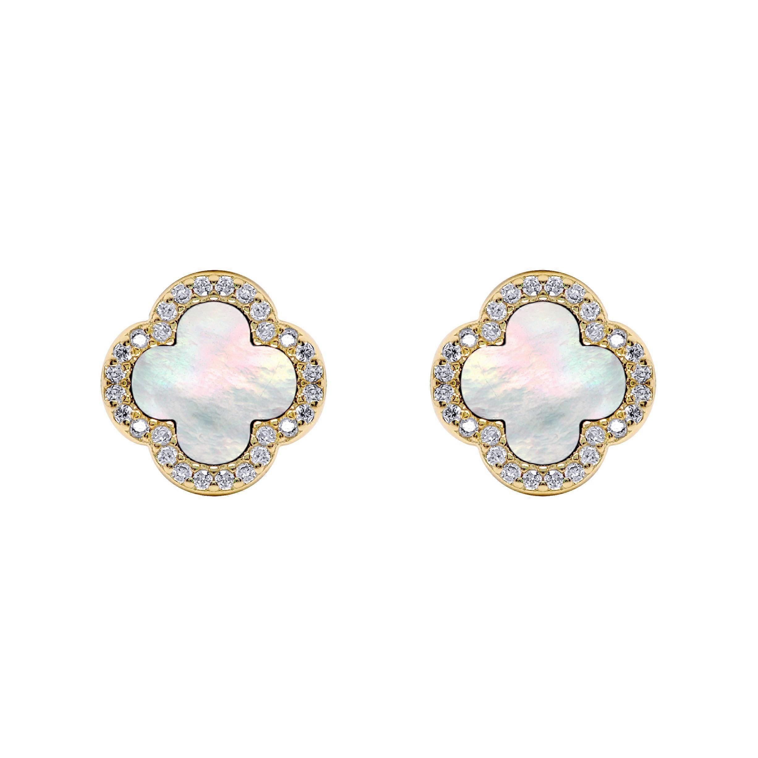 Jewelco London Gold-plated Silver Clover Mother of Pearl & CZ Halo Lucky Charm Earrings 11mm
