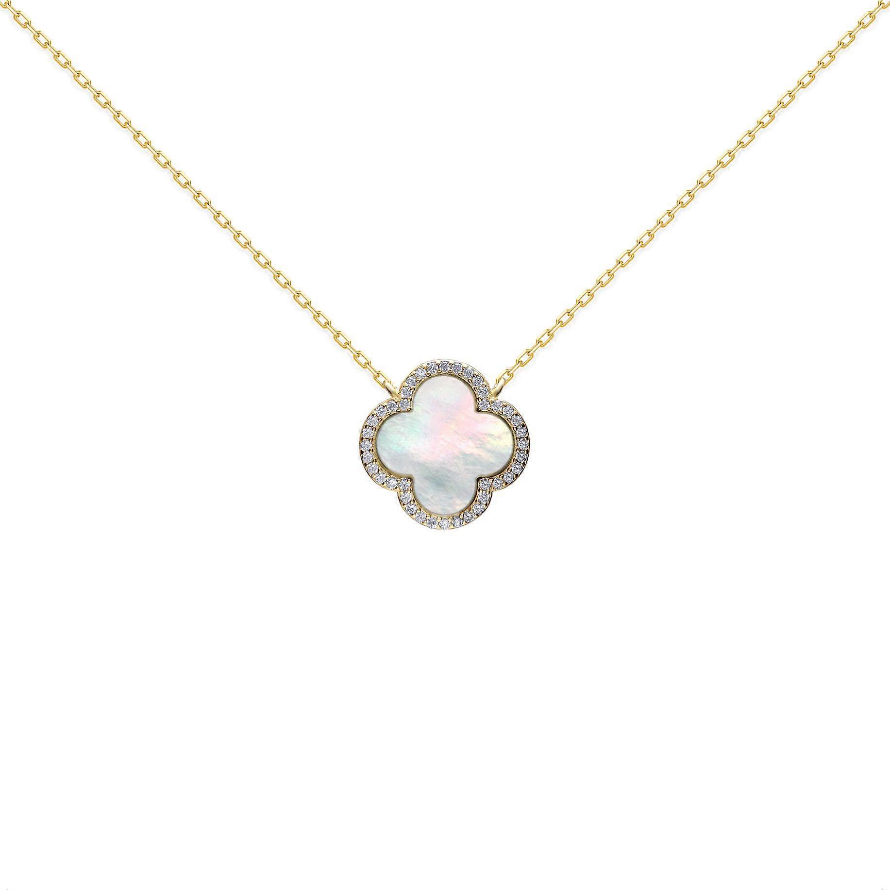 Jewelco London Gold-plated Silver Clover Mother of Pearl & CZ Halo Lucky Charm Pendant Necklace 16-18"