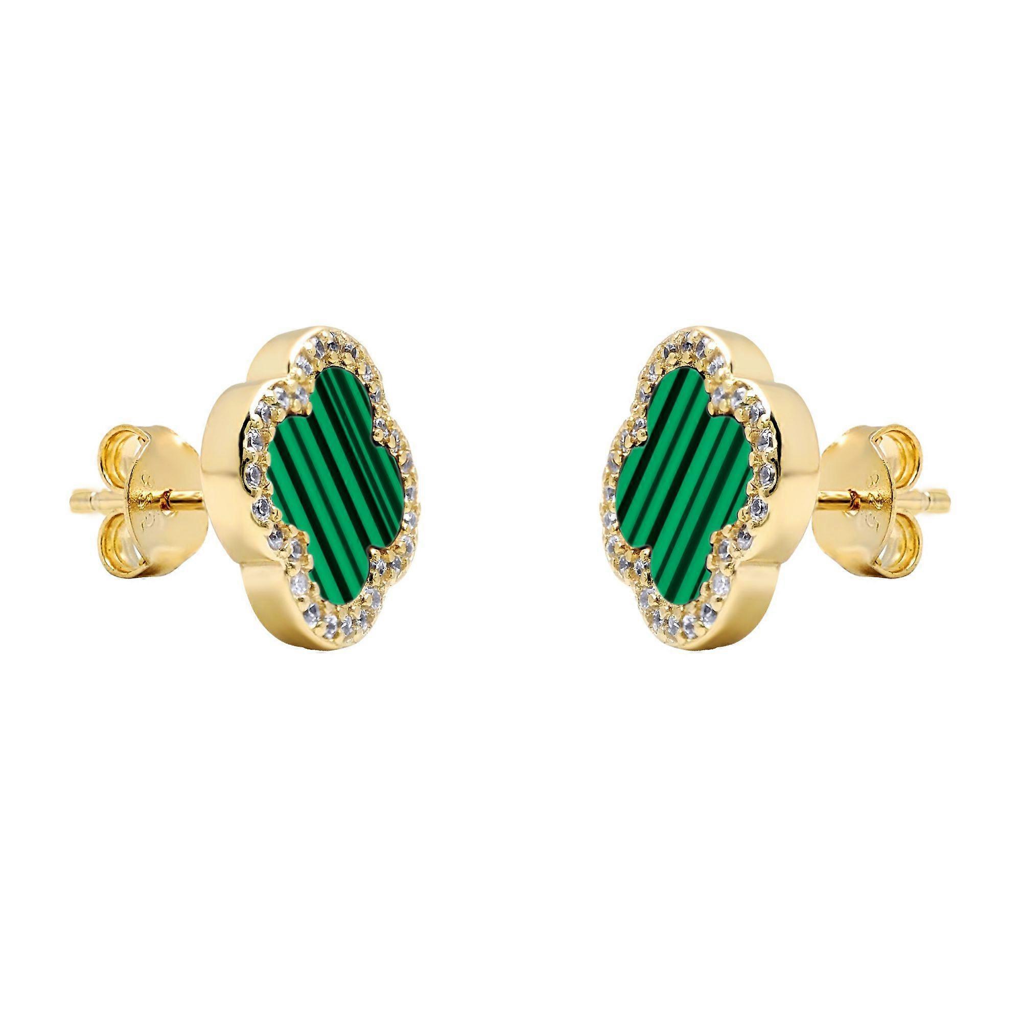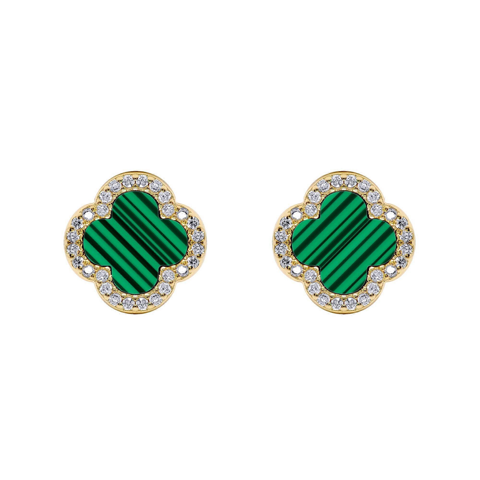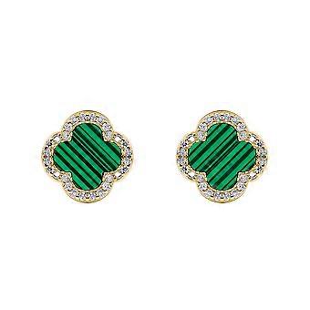 Jewelco London Gold-plated Silver Green Clover Malachite & CZ Halo Lucky Charm Earrings 11mm