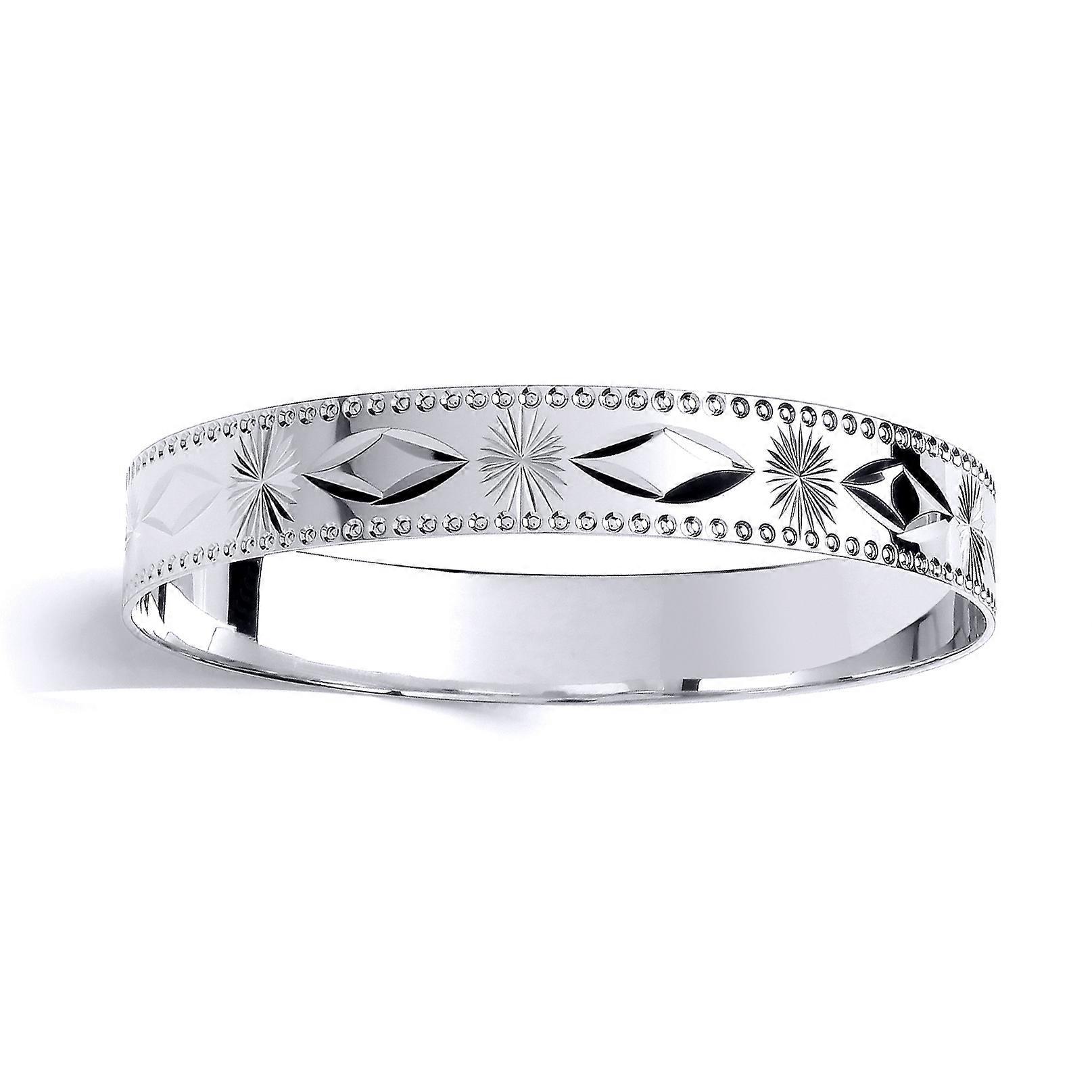 Jewelco London presents this piece from its latest collection of jewellery, a kids baby bangle bracelet made of rhodium plated sterling silver in a diamond-cut engraved star burst bead edge diamond pattern slave design# #. Approx dimensions: 10mm | 60mm | Width: 60mm Gauge: 10mm Weight: 13.5g SKU: BN75