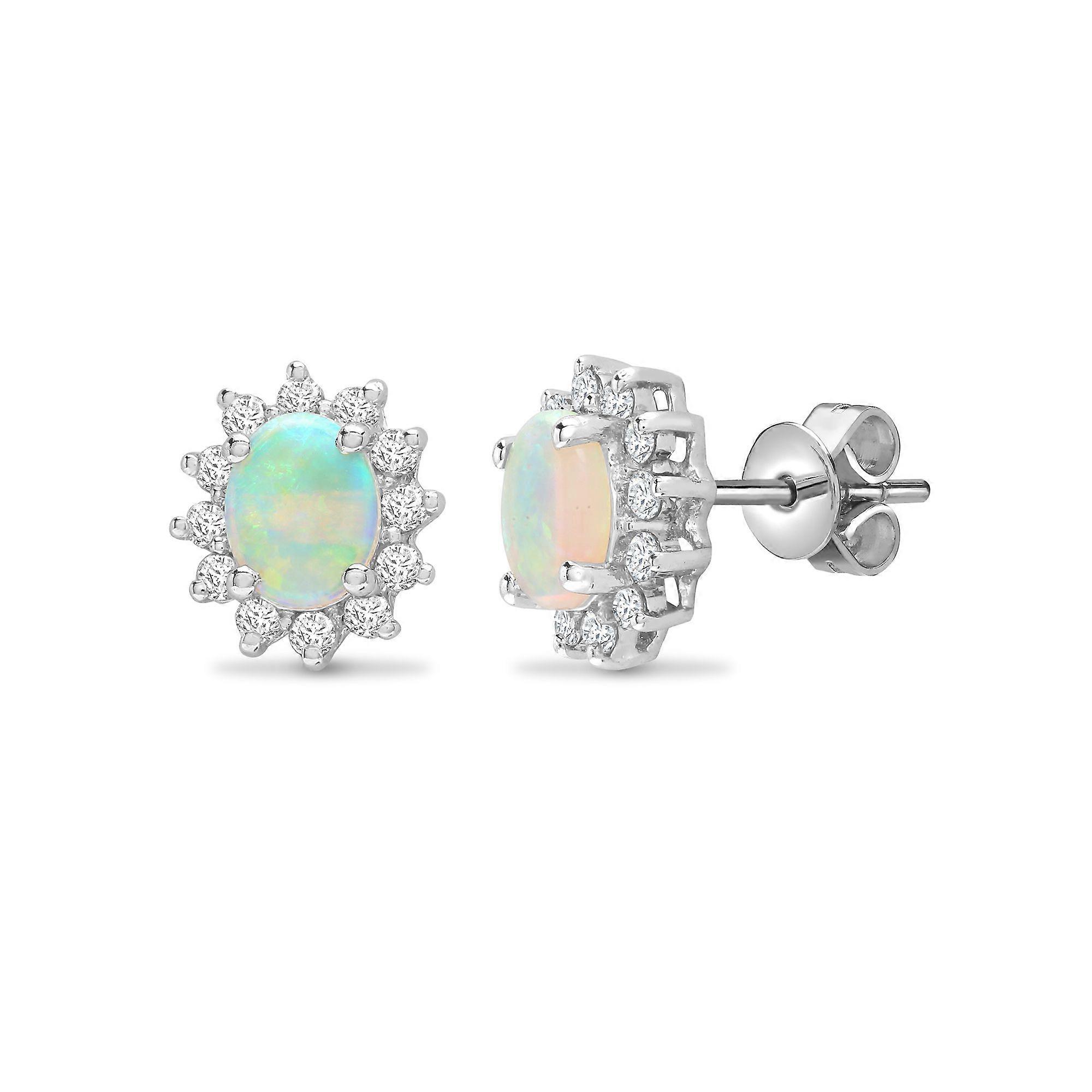 Jewelco London Ladies 18ct White Gold Cluster Set Round G SI 0.19ct Diamond and Oval Opal Royal Cluster Stud Earrings