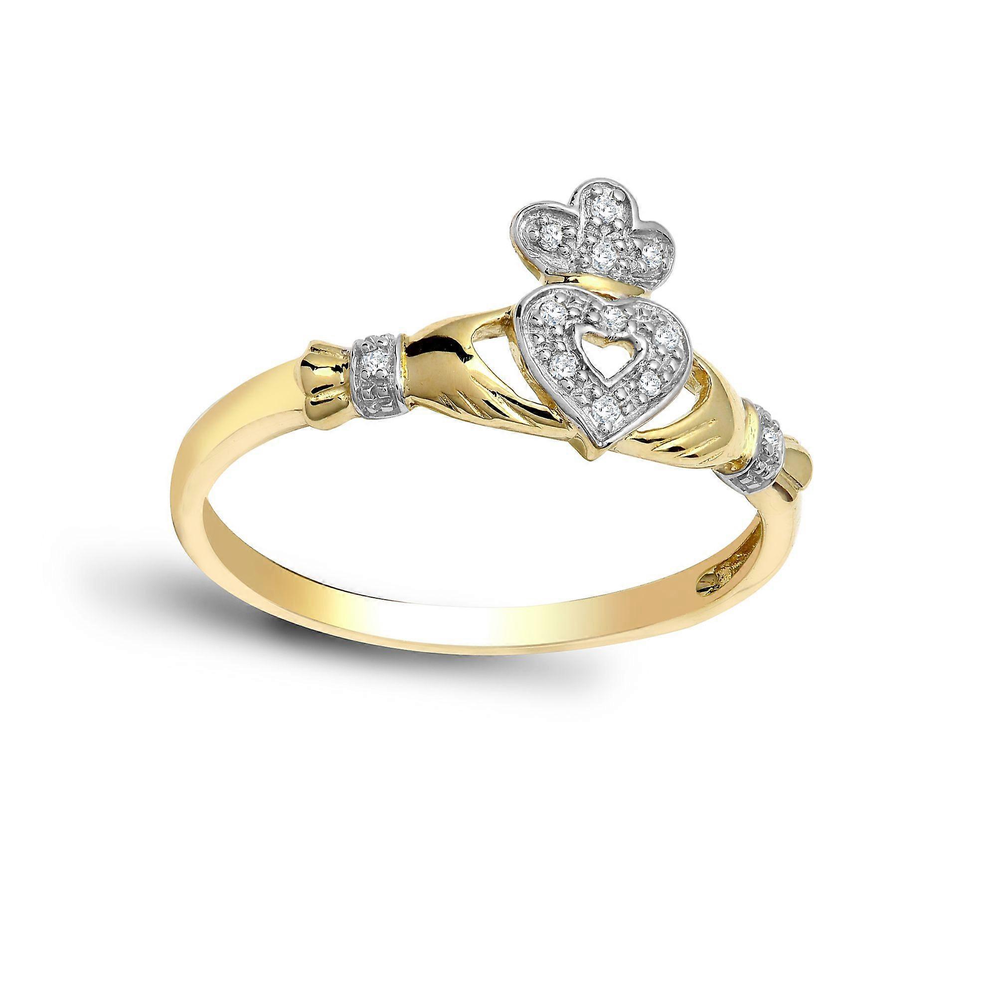 Jewelco London Ladies 9ct Gold Pave Set Round H I2 0.05ct Diamond Claddagh fáinne Chladaigh Cocktail Ring 10mm