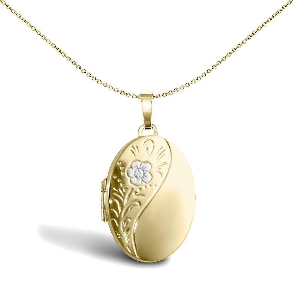 Jewelco London Ladies 9ct Yellow and White Gold Engraved Flower Oval Locket Pendant