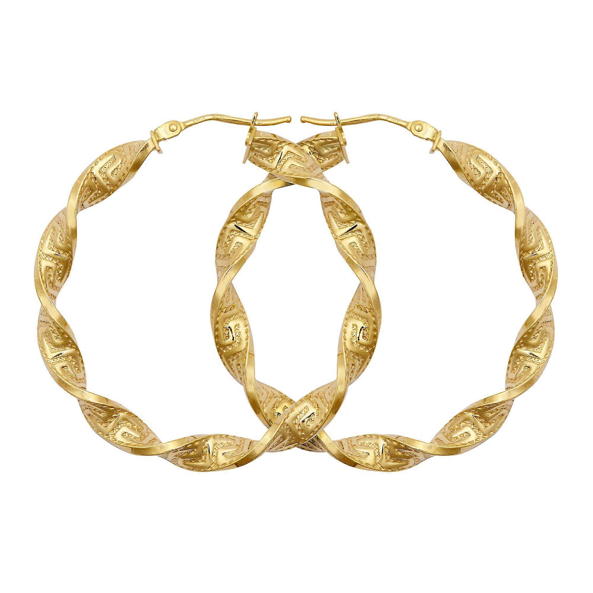 Jewelco London Ladies 9ct Yellow Gold Greek Key Ribbon Twist 4mm Hoop Earrings 37mm