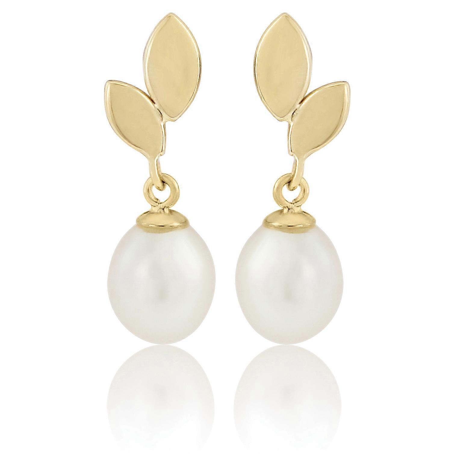 Jewelco London Ladies 9ct Yellow Gold Leaf Cultured Oval Pearl Drop Earrings 7mm