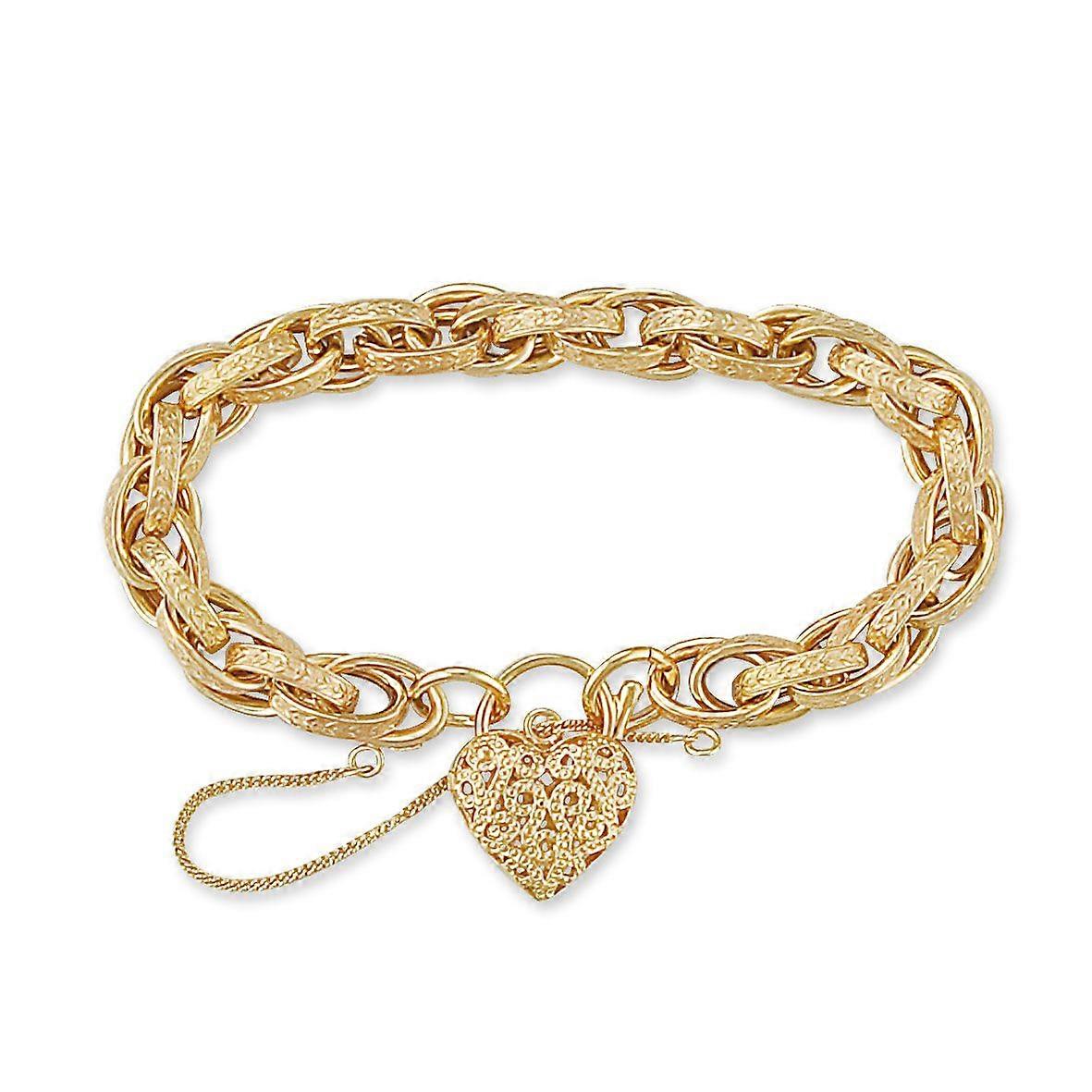 Jewelco London Ladies 9ct Yellow Gold Love Heart Padlock Victorian Engraved Prince Of Wales 9mm Gauge Bracelet