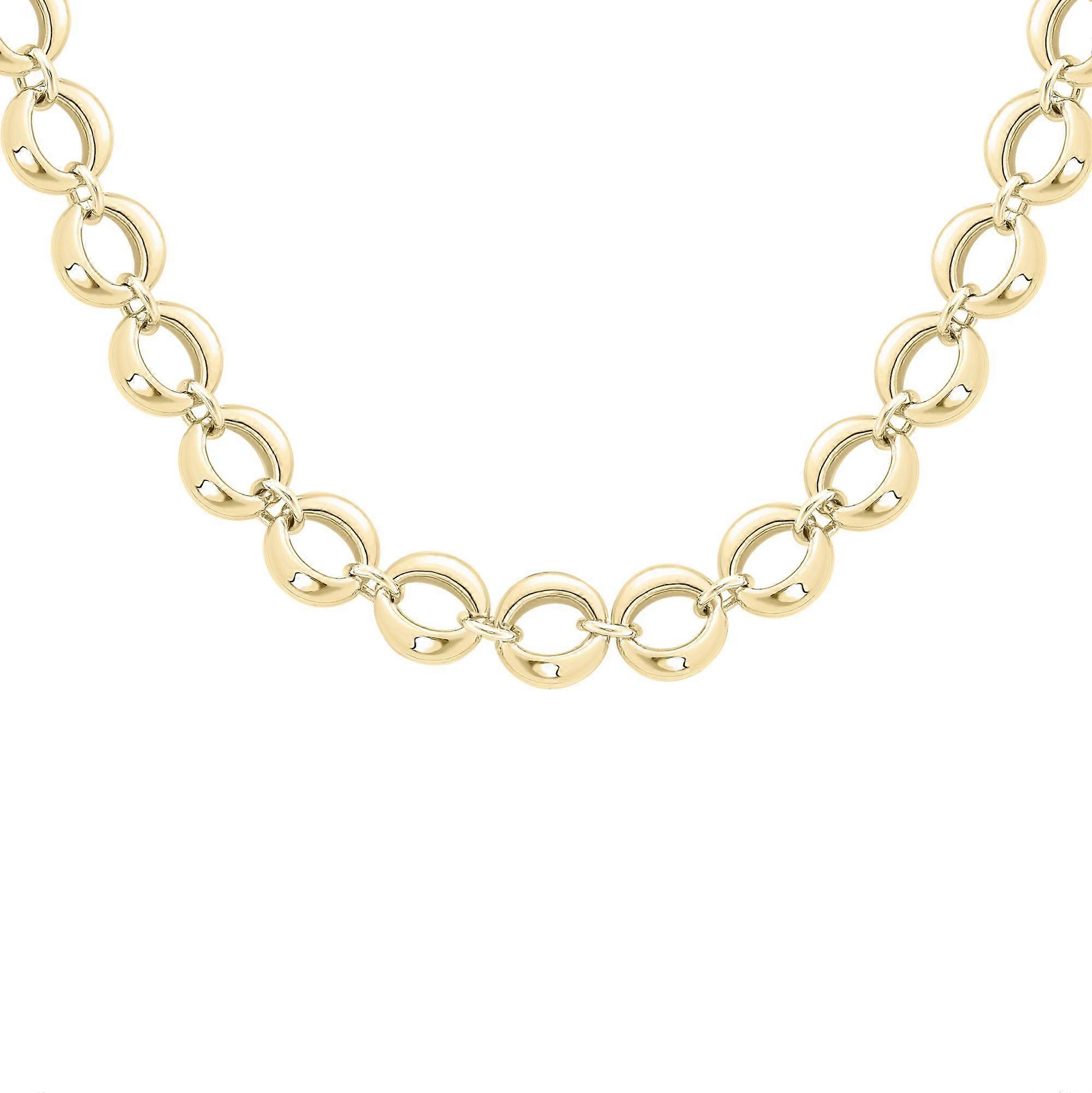 9ct yellow gold flat domed round links are used to create this classic looking ladies necklace that is secured with a bold fishhook clasp. Overall Dimensions: 8 x 3mm Height: 8mm Width: 3mm Length: 430mm Weight: 16.5g SKU: CANR02071-17
