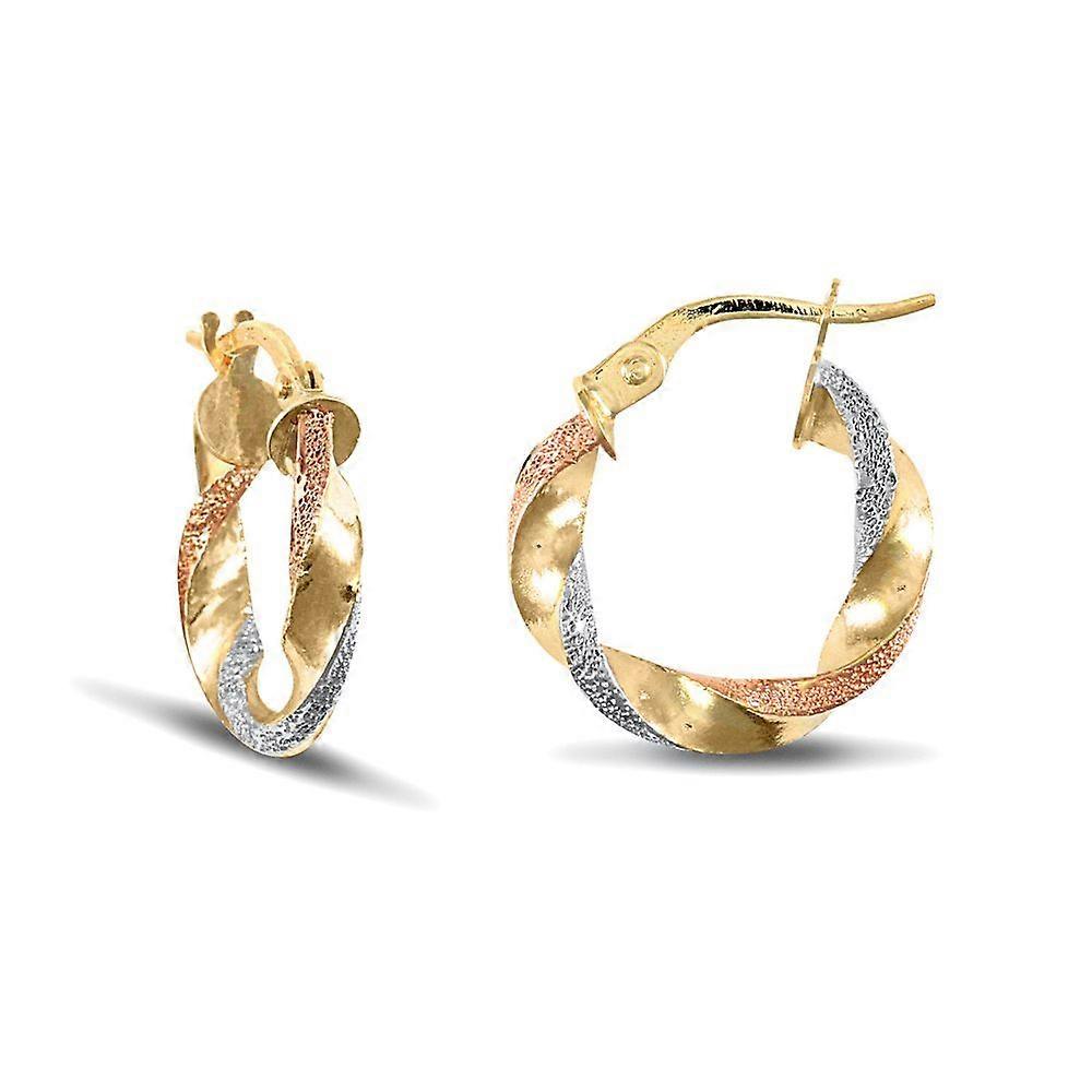 Jewelco London Ladies 9ct Yellow White and Rose Gold Frosted Twisted 3mm Hoop Earrings 16mm