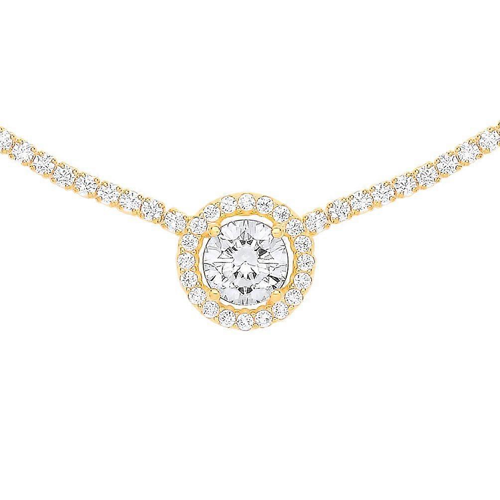 Jewelco London Ladies Gold-Plated Sterling Silver CZ Round Solitaire Halo Cluster Tennis Necklace 2mm 14 + 2 inch