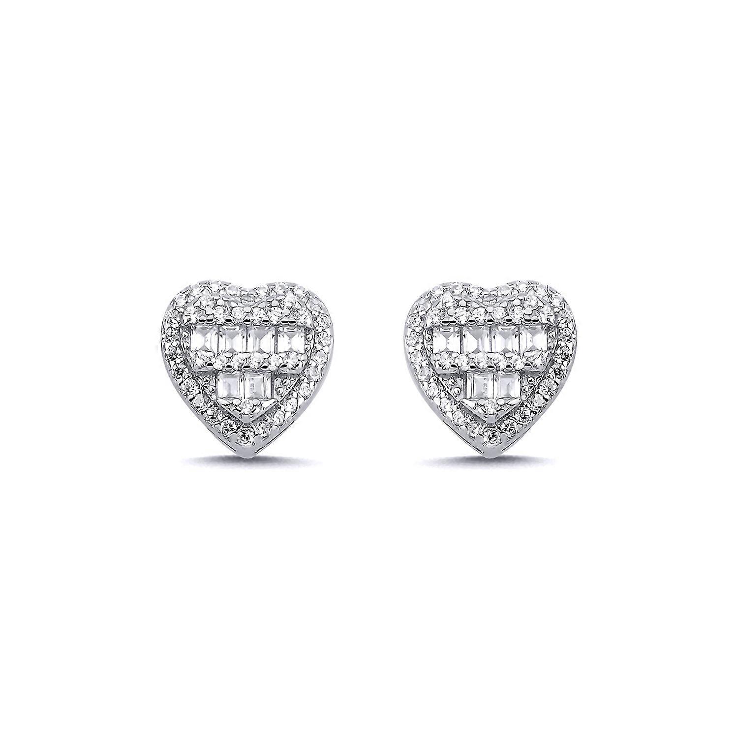 Jewelco London Ladies Rhodium Plated Sterling Silver Baguette Cubic Zirconia Tiered Love Heart Stud Earrings, 10mm