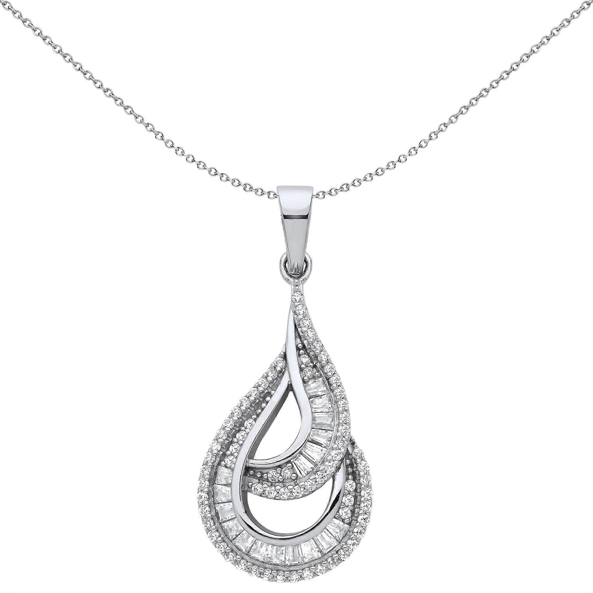 Jewelco London Ladies Rhodium Plated Sterling Silver Baguette CZ Twist Spiral Staircase Avocado Pendant Necklace 18 inch