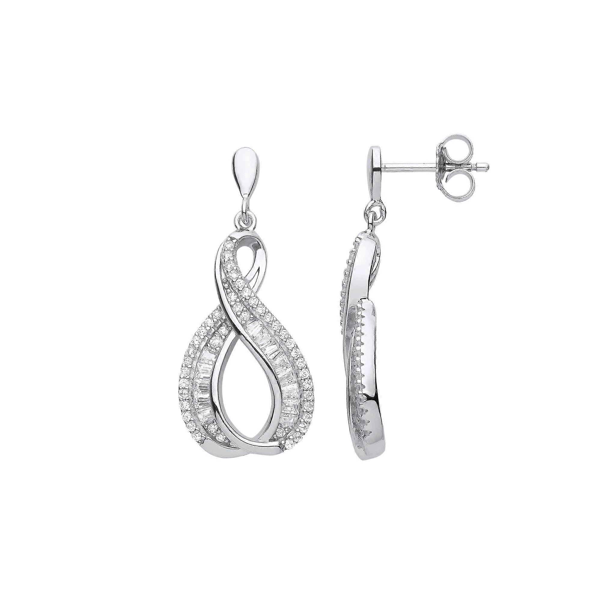Jewelco London Ladies Rhodium Plated Sterling Silver Baguette CZ Warped Figure 8 Infinity Eternity Drop Earrings