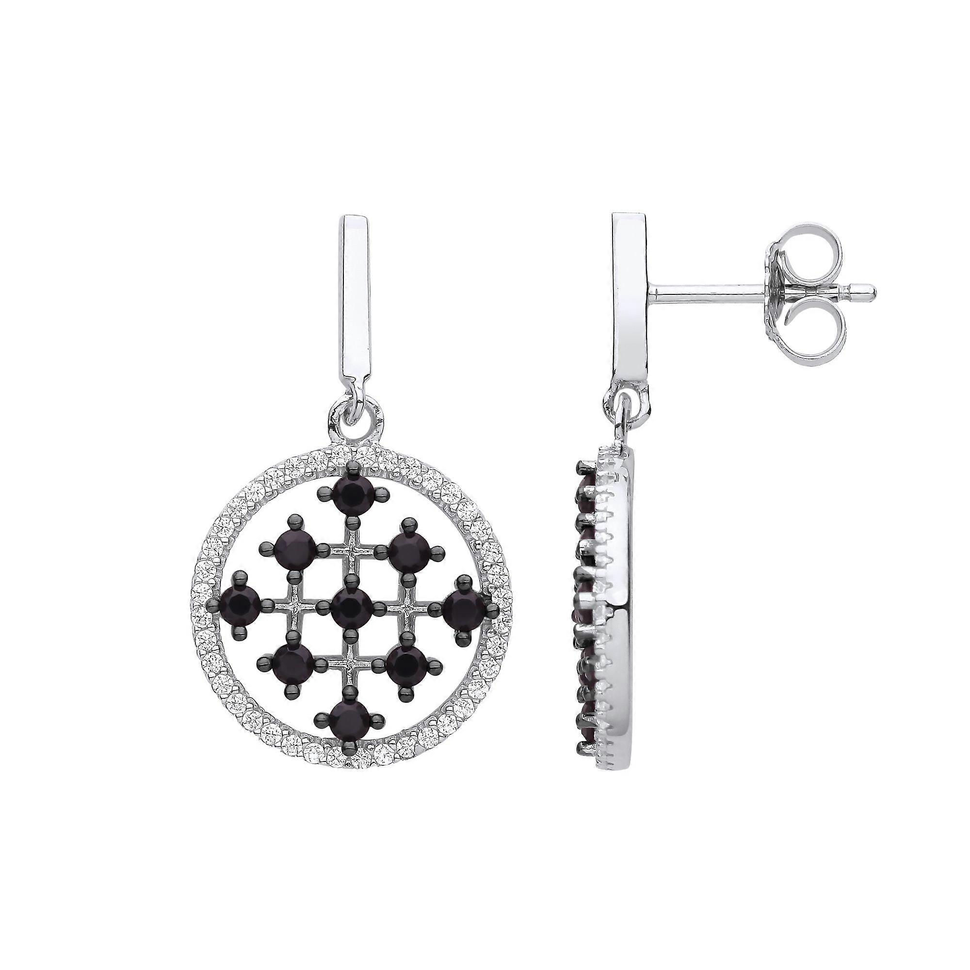 Jewelco London Ladies Rhodium Plated Sterling Silver Black CZ Jerusalem Cross Halo Cluster Drop Earrings