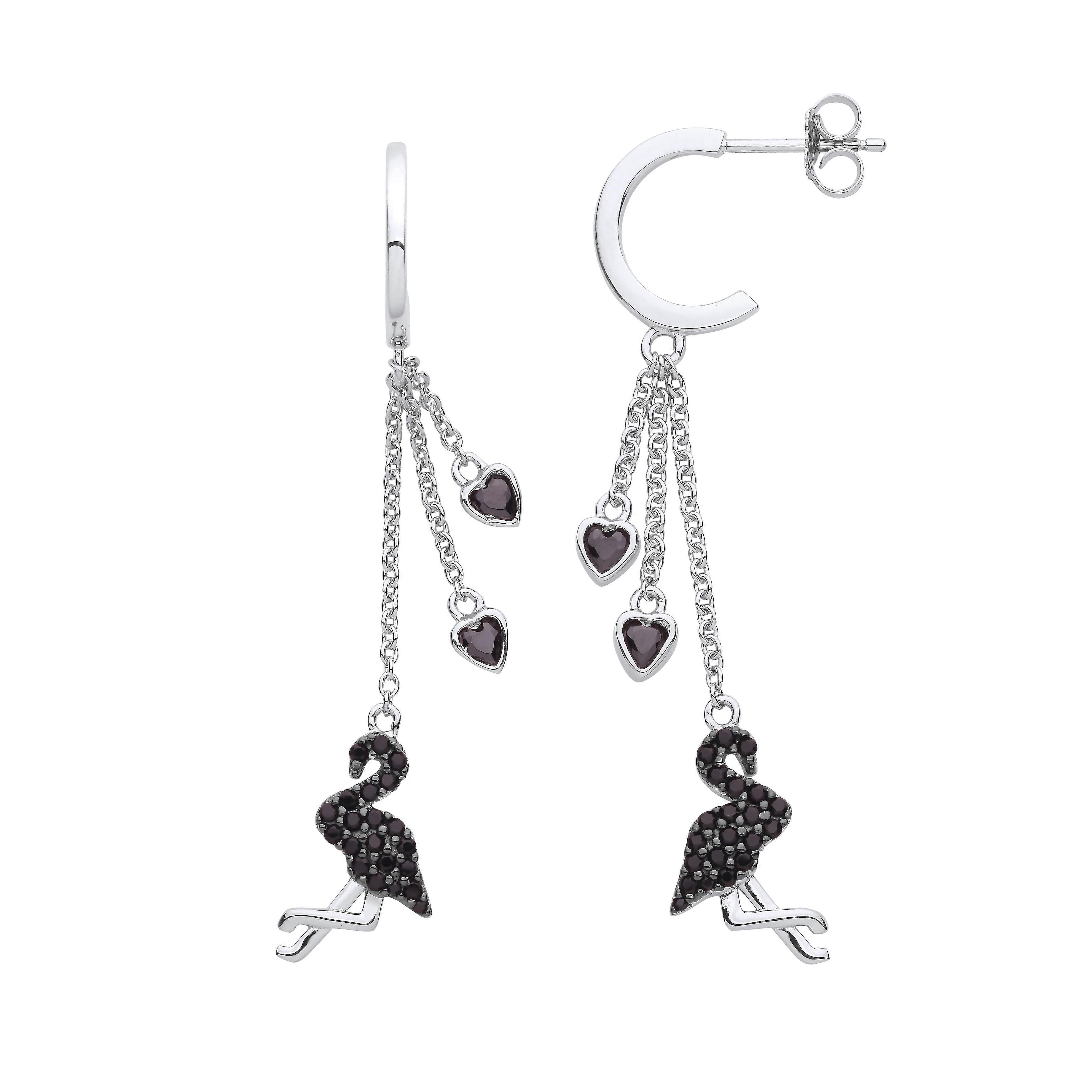 Jewelco London Ladies Rhodium Plated Sterling Silver Black Heart CZ Love Heart Flamingo 2/3 Hoop Chain Drop Earrings