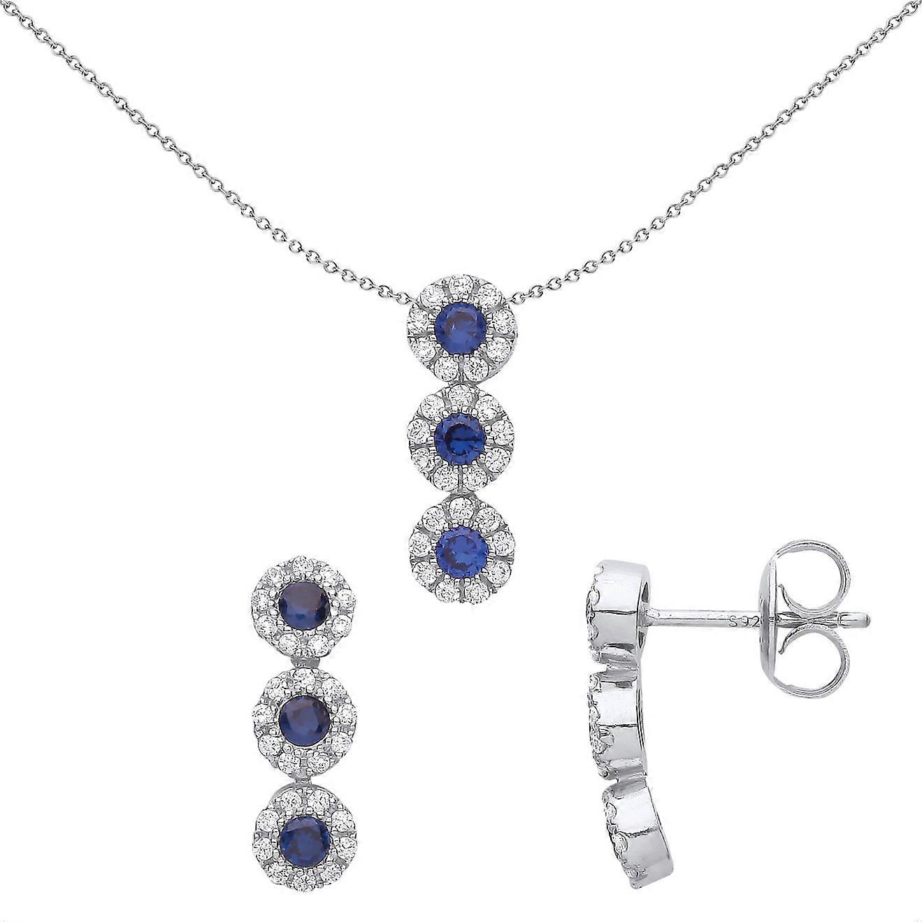 Jewelco London Ladies Rhodium Plated Sterling Silver Blue CZ Trilogy Halo Cluster Earrings Necklace Set