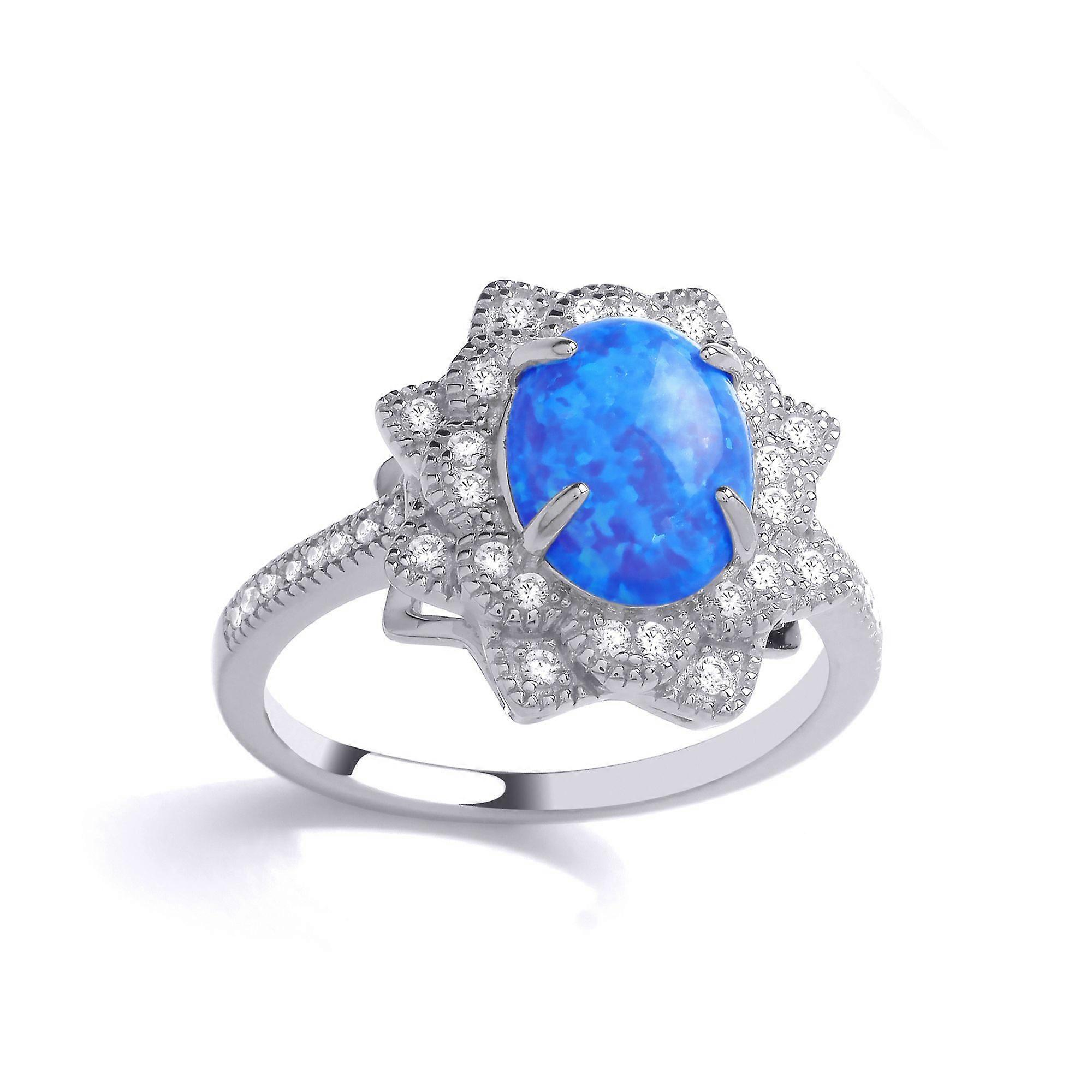 Jewelco London Ladies Rhodium Plated Sterling Silver Blue Oval Opal CZ Luxury Mosaic Starry Pool Cocktail Ring