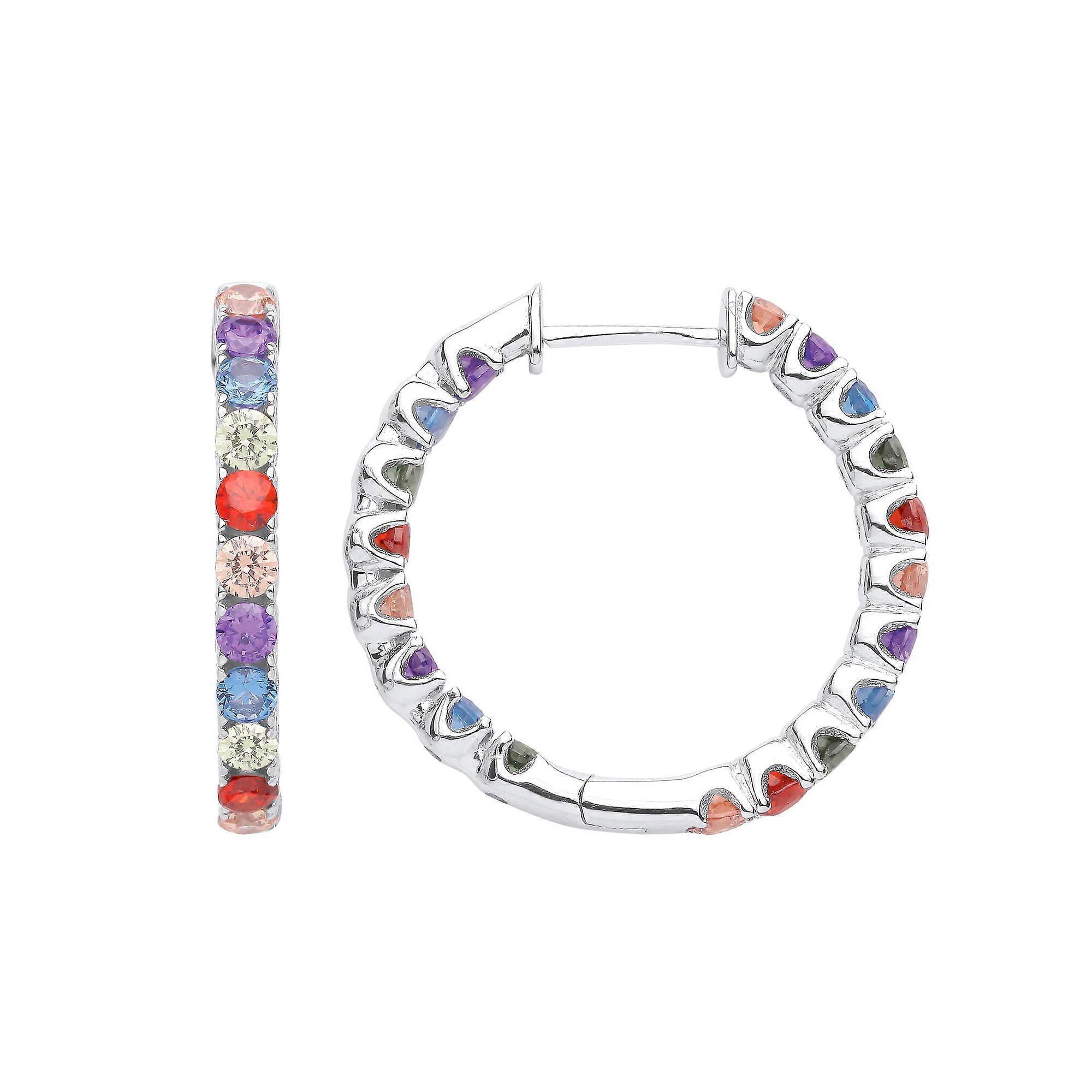 Jewelco London Ladies Rhodium Plated Sterling Silver Blue Red Green CZ Circle of Life Coral Rainbow Hoop Earrings